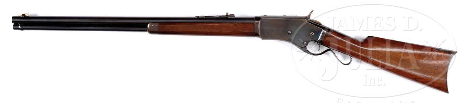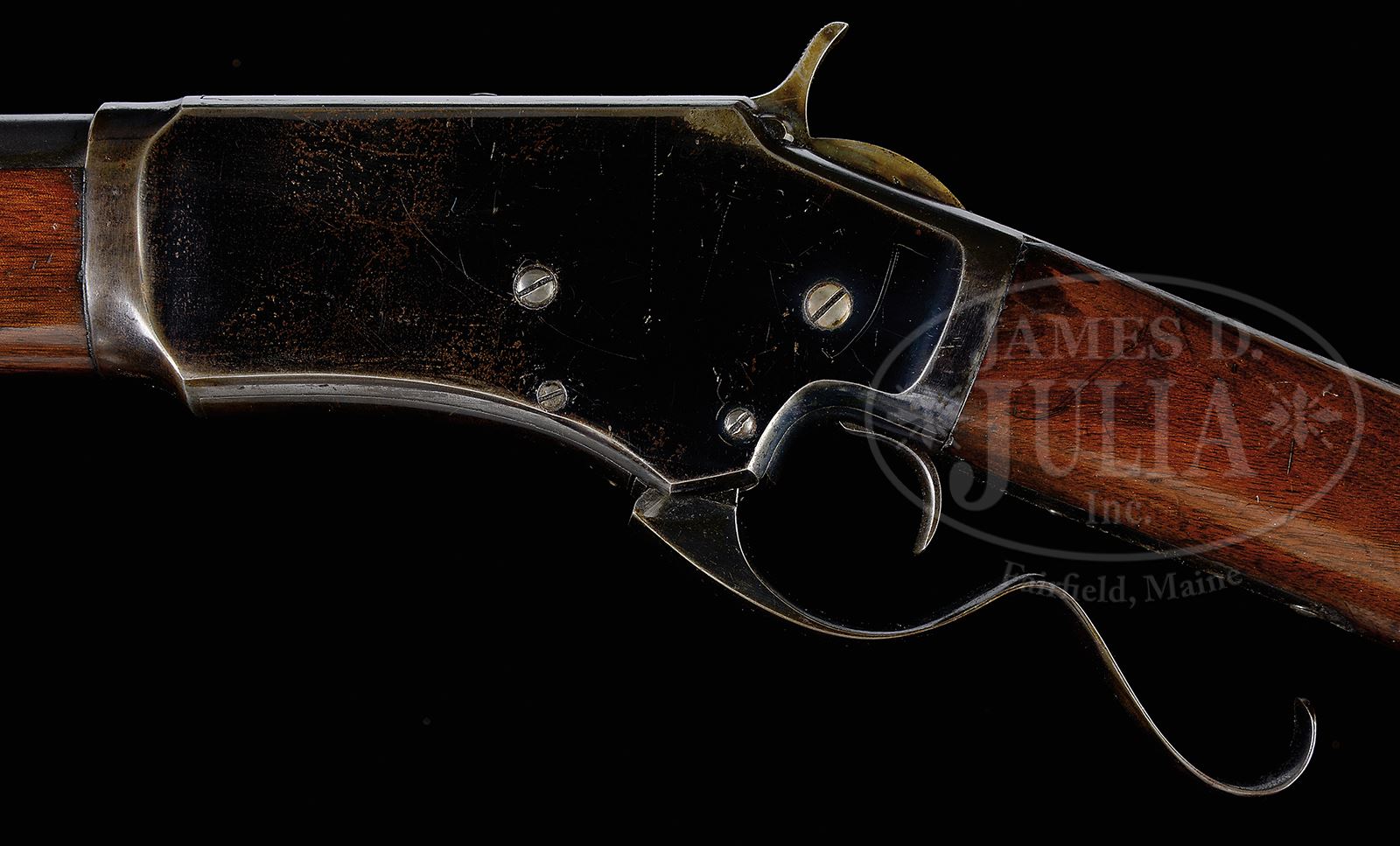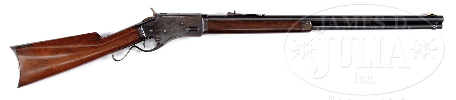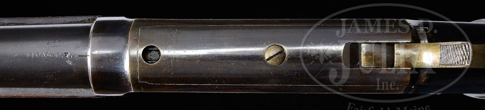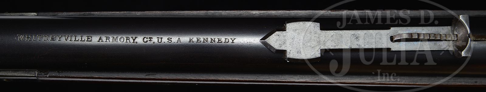 SN A884. Cal. 44 WCF Standard grade rifle with 24″ rnd bbl, full magazine, nickel silver Rocky Mountain front sight & orig Whitney flat top, V-notch rear sight. Top of bbl has the marking “WHITNEYVILLE ARMORY CT. U.S.A. KENNEDY” forward of the rear sight with Cal. marking over chamber area. Lever is serpentine shaped. Mounted with uncheckered, straight grain American walnut with straight stock and crescent buttplate with trap. SN was observed on bottom of lower tang, left side of upper tang under the wood, rear face of buttstock & inside toe of buttplate. According to Flayderman’s Guide to Antique American Firearms there were about 15,000 Whitney-Kennedy Arms produced during the period 1879-1886 in both large and small frame rifles, muskets & carbines in a large variety of calibers. The small frame arms were produced in 44-40, 38-40 & 32-20. Apparently Whitney serialized their arms from 1 to about 5000 and then began a re-numbering process adding the alpha prefix such as found here. They changed the prefix at number 1000 and resumed with SN 1 under the new prefix. While these rifles were very well made and reliable, they were heavier than the competing Winchester rifles and simply never gained popularity with the buying public. PROVENANCE: The Estate Collection of Phil A. Bleakney, Jr. CONDITION: Very fine to extremely fine, all matching. Bbl & magazine tube retain about 98% crisp orig blue with only faint muzzle edge wear and a couple of small nicks. Receiver retains about 93-95% orig blue, lightly flaked on both sides and thin on the bottom with a couple of small nicks & scratches on the sides. Lever, hammer & buttplate retain dark case colors. Stock has a couple of small chips by the top tang with some minor oil staining around top tang, otherwise wood is sound and overall retains virtually all of its beautiful factory piano varnish finish with light nicks & scratches and a series of small nicks on the forearm. Mechanics are fine. Brilliant shiny bore shows very little use with virtually all of its orig finish on bolt face & carrier. 49059-112 JR (7,000-10,000) – Lot 3114
