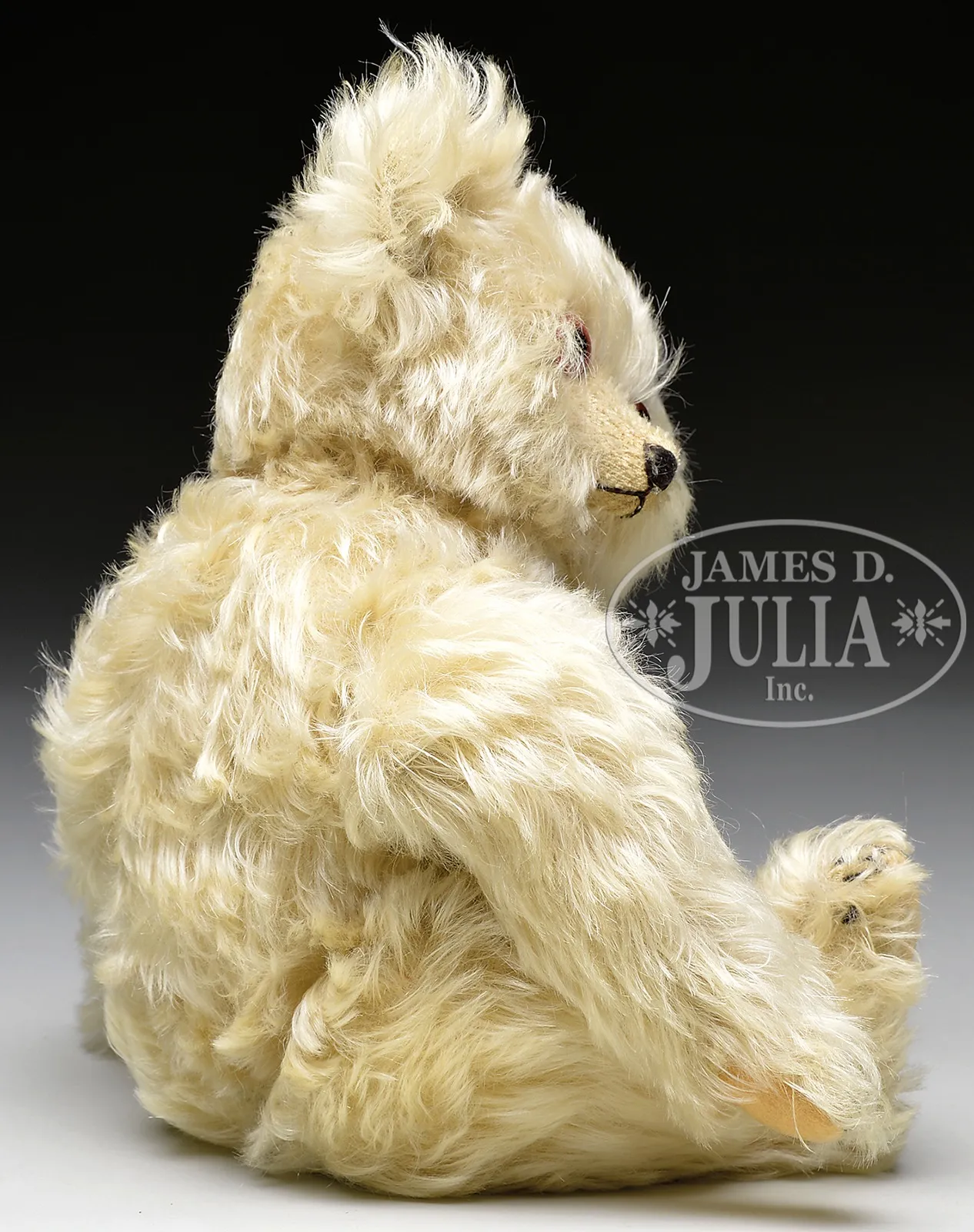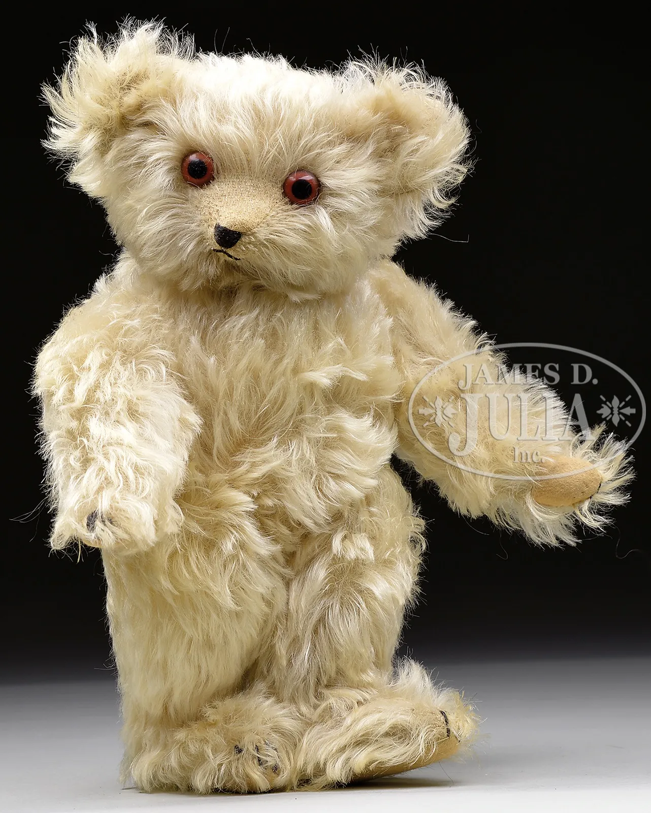 BEAUTIFUL 1920s ERA JOPI MUSICAL BEAR.Teddy is made from very long and very elegant cream colored mohair and is 5-ways jointed. Bear has typical Jopi features including very long narrow feet, tiny hand pads and short closed claw embroidery. Face is detailed with oversized brown and black pupil eyes and a very small black hand-embroidered mouth. Bear has working press and release music box in its belly. This bear is very representative of teddy bear designs of the 1920s, which had a very distinctive wide eyed, feminine, and endearing appearance. Working Jopi musical teddy bears of this era are quite infrequent on the secondary market. SIZE: Overall 12-1/2″ t (31cm). Sitting 8-1/2″ t (22cm). PROVENANCE: Chuck & Cathy Steffes Collection. CONDITION: Very slight soiling of felt paw pads. Otherwise very good. 1-13846 (500-1,000) – Lot 3115 Auction: Advertising, Toy & Doll - Spring 2014 Please Note: All prices include the hammer price plus the buyer’s premium, which is paid by the buyer as part of the purchase price. The prices noted here after the auction are considered unofficial and do not become official until after the 46th day. |