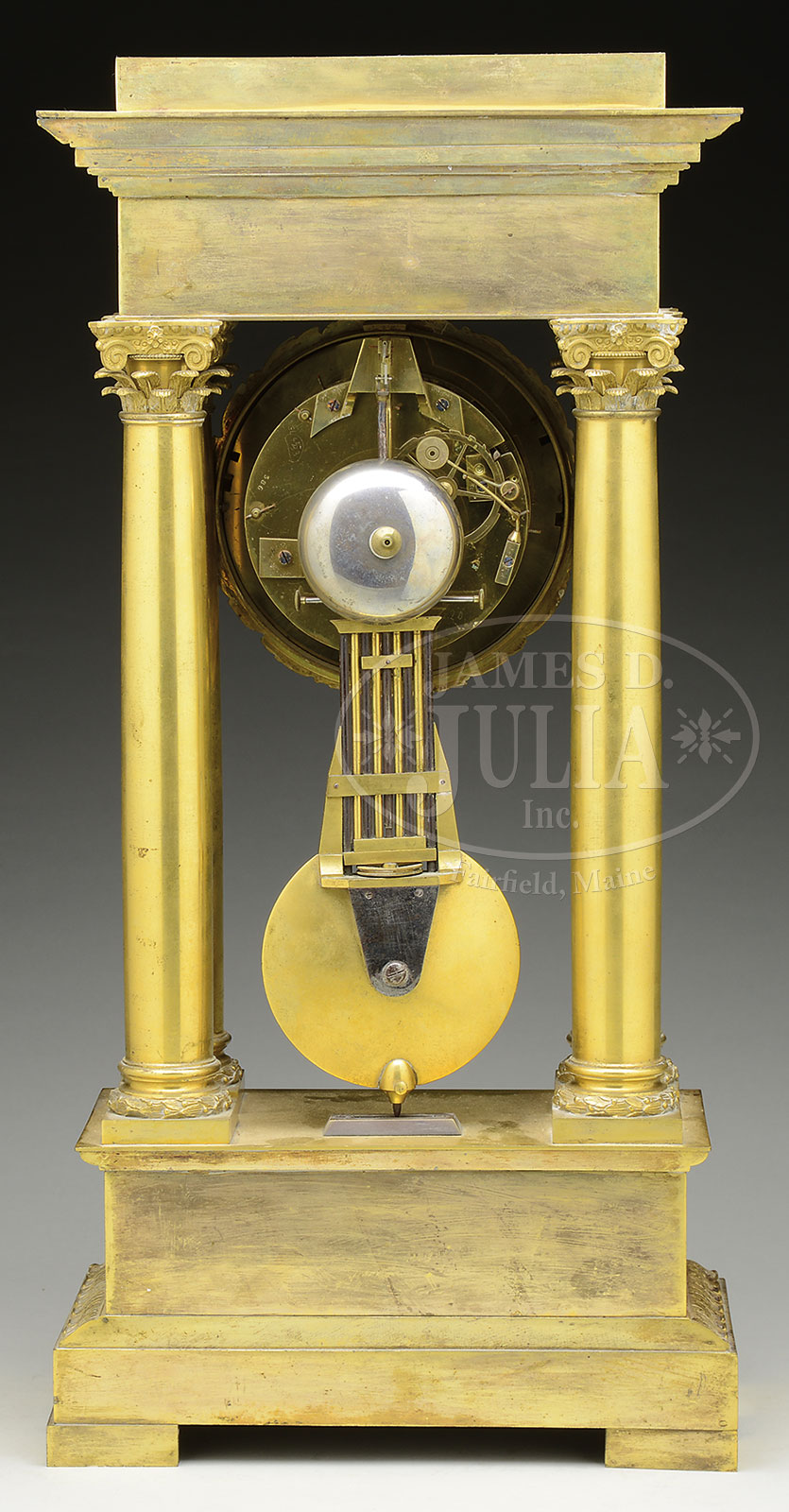 FINE CLASSICAL REVIVAL FRENCH BRASS PORTICO CLOCK.Second half 19th century. Of typical form with burnished brass case. The rectangular case with molded cornice cast with flowers and dentil molding above the frieze applied with a cast floral wreath flanked by lyres, raised on free standing Corinthian columns centering the burnished brass dial within a wreath border. The Roman numeral chapter ring with time and strike apertures, striking on a bell at the hour and half-hour. The movement with count wheel. The backplate stamped with the numeral “386” with original brass pendulum. The brass base with intertwined cast floral wreaths in the apron above the athemion leaf molded plinth raised on square feet. SIZE: 22-1/2″ h x 11″ w x 5-3/4″ d. CONDITION: Burnished brass case in very good condition. Movement appears clean and serviceable, but with broken suspension spring. Otherwise very good. Patinated dore suface has been abraded and worn away on proper left front corner of portico roof. 52335-5 (1,000-1,500) – Lot 3116