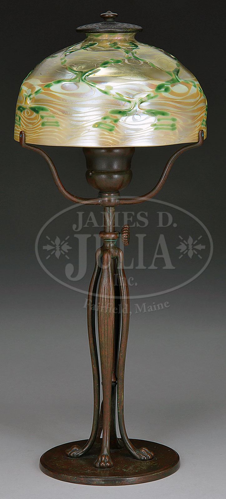 TIFFANY STUDIOS ADJUSTABLE DESK LAMP.Tiffany Studios desk lamp has gold favrile domed shade with slightly raised diamond quilted design in green iridescence set against a bright gold iridescent Damascene background shading to a cream and gold iridescent King Tut design at rim. Shade is signed on the fitter “L.C.T.” and rests on a bronze adjustable lamp base with 4 vertically ribbed legs terminating in cats paw feet on top of a round bronze platform. Lamp has a single socket and three arm spider. Base is finished in rich brown patina with green highlights. Base is signed on the underside “Tiffany Studios New York 427″. Lamp is completed with original Tiffany cap. SIZE: Adjusts from 16″ to top of cap to 20-3/4”. CONDITION: Shade is very good to excellent. Base is very good to excellent with some minor wear to patina on spider. The end of each spider arm is drilled and threaded for a tension screw but no screws are present. Rewired with appropriate cloth cord. 5-69471 (7,000-8,000) – Lot 3120