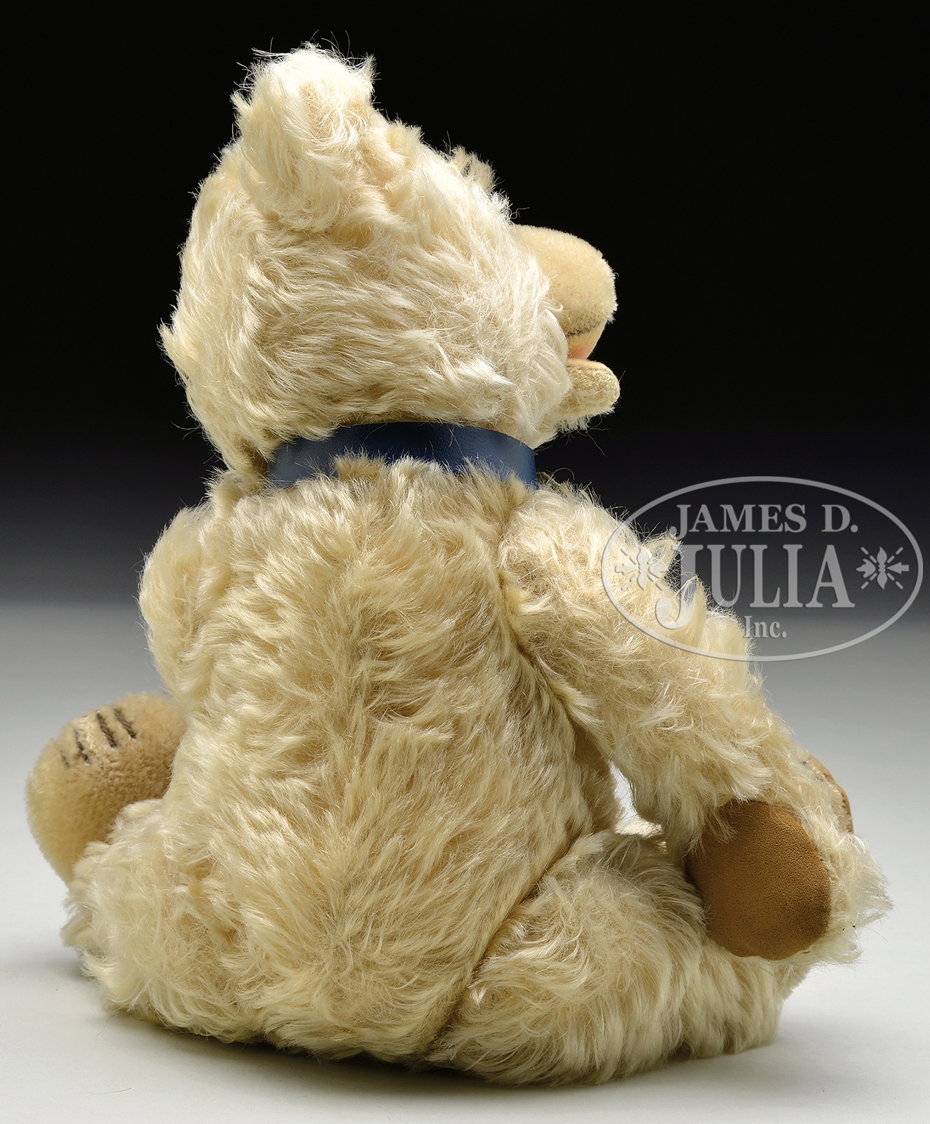 TWO 1950s ERA COLLECTIBLE STEIFF TEDDY BEARS.Lot of two sweet and collectible five-ways jointed blond Steiff Teddy bears. To include a post war “Original Teddy” and a mid-1950s Teddy Baby. Original Teddy has a stocky build, prominent and fuzzy muzzle, felt paw pads, black facial and claw stitching, brown and black pupil eyes, and four claws on each hand. Teddy Baby has a shorter blond mohair insert muzzle, a hand-embroidered nose, brown and black glass pupil eyes, faux suede material on paws, an open felt lined mouth, and an original blue collar and bell. SIZE: Standing: 16″ (40cm); Sitting 12″ (20 cm) and Standing: 11-1/2″ (29cm); Sitting: 9-1/2″ (24cm) respectively. CONDITION: Original Teddy with restitched nose, possible restitched claws, repairs to felt paw pads, and slight fading and gentle playwear. Teddy Baby with dusty paw pads and general light playwear. 1-14309, 1-14310 (600-1,200) – Lot 3120n Auction: Advertising, Toy & Doll - Spring 2014 Please Note: All prices include the hammer price plus the buyer’s premium, which is paid by the buyer as part of the purchase price. The prices noted here after the auction are considered unofficial and do not become official until after the 46th day. |