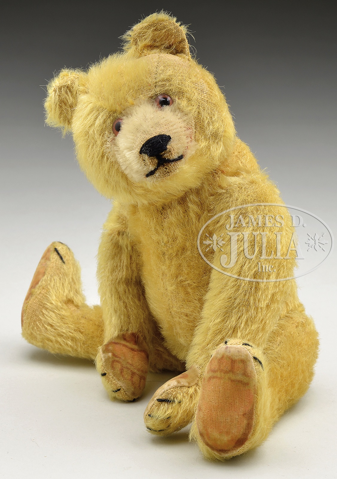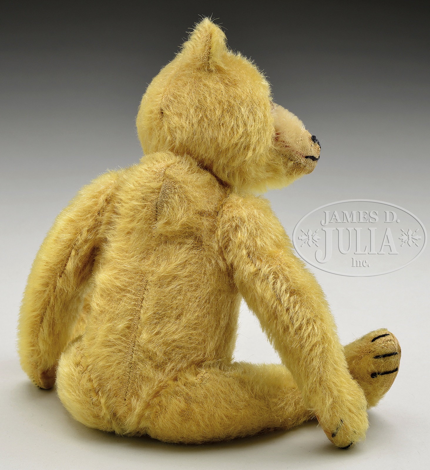 STEIFF MOHAIR DICKY BEAR WITH STENCILED VELVET PAW PADS.Adorable five-ways jointed gold blond Dicky bear from the circa 1930-1937 time frame. With lighter inset muzzle. Black hand-embroidered mouth, nose, and claws. Brown and black pupil eyes with airbrushed highlights on face. Velvet paws with traditional paw stenciling. Four claws. Working squeaker. This pattern was designed as a less expensive novelty item and was produced overall from 1930 to 1937 in 12 sizes ranging from 15 to 75cm in blond and white mohair. SIZE: Standing: 10″ (25cm). Sitting: 7″ (18cm). CONDITION: General overall playwear and thinning, stenciling a bit faded, otherwise good to very good. 1-14316 (2,500-3,500) – Lot 3120p Auction: Advertising, Toy & Doll - Spring 2014 Please Note: All prices include the hammer price plus the buyer’s premium, which is paid by the buyer as part of the purchase price. The prices noted here after the auction are considered unofficial and do not become official until after the 46th day. |
