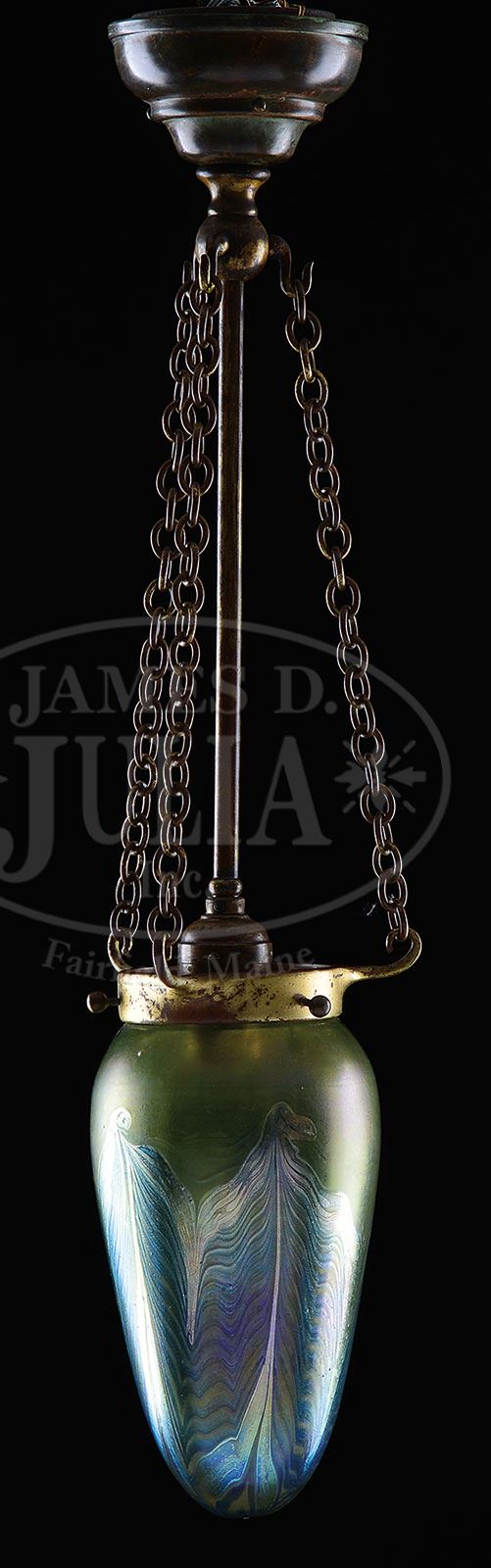 TIFFANY STUDIOS STALACTITE HANGING LAMP.Tiffany Studios hanging lamp has stalactite shade with blue iridescent hooked feather design extending upward from the bottom of the shade. Each hooked feather is outlined in platinum iridescence. All set against a lightly iridescent background. Shade is unsigned and numbered “S9944”. Shade is suspended from three bronze chains that attach to a Viking ball on a single shaft leading to a single socket. Fixture is completed with a reproduction sealing cap. SIZE: Shade: 8″ l. Lamp is 23-1/2″ from ceiling to bottom of shade. CONDITION: Shade is very good to excellent with one small white silica inclusion at the shoulder (from the making). Bronze hardware has considerable wear and discoloration to patina. 5-69203 (6,000-8,000) – Lot 3121