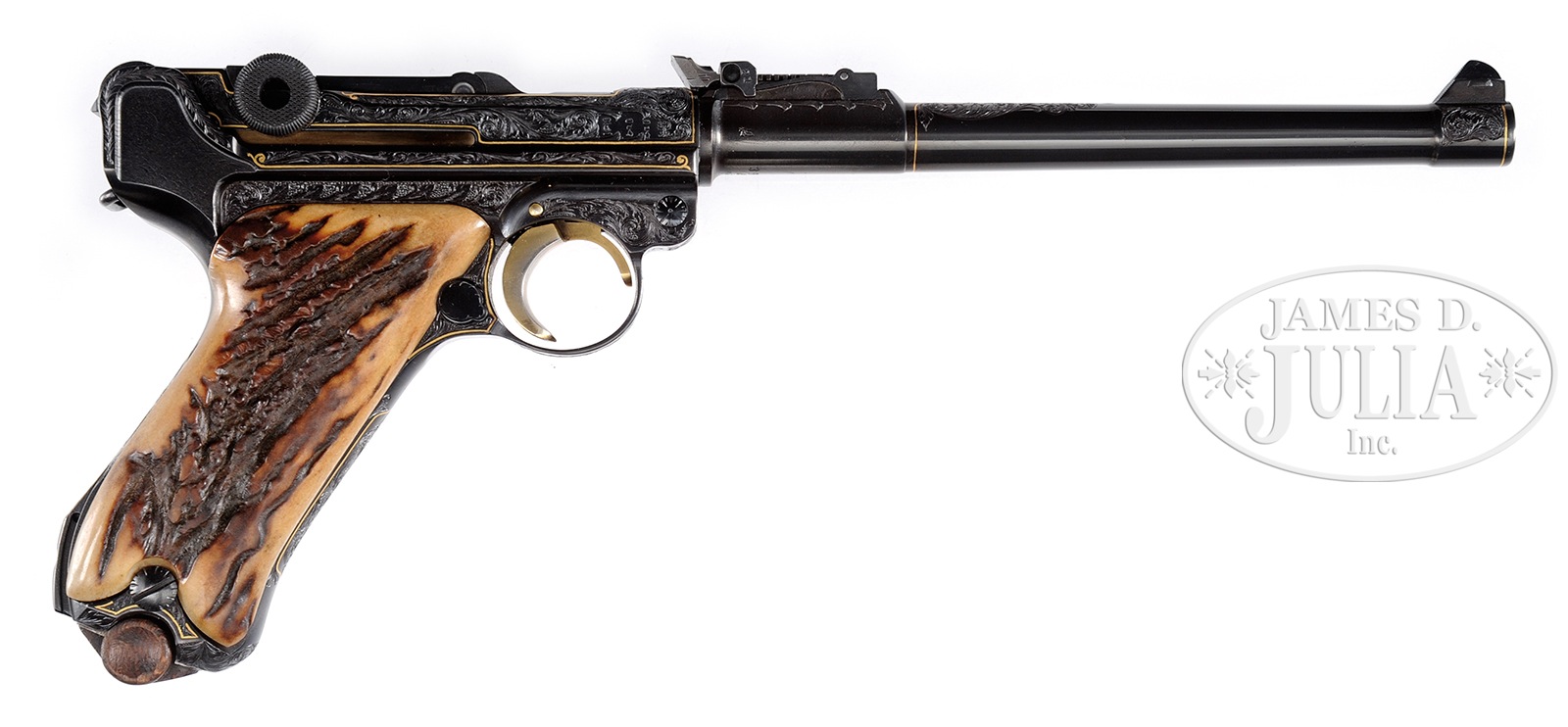 *BEAUTIFUL ENGRAVED ARTILLERY LUGER WITH GOLD INLAY AND STAG GRIPS.SN 3921E. Cal. 9mm. 8″ Artillery bbl with Artillery sights and full SN on bottom. 1917 date above chamber. DWM scroll on center toggle link. Imperial proofs on right receiver. Numbers are matching except for holdopen and trigger which are numbered 48. Stag grips. Plain wood bottom magazine. Foliate scroll engraving with pearl background covers about 60% of exterior surfaces of gun with gold line inlays on almost every major surface. Date on chamber, “P.08” on left frame, and SN on front are gold inlay. CONDITION: Excellent retaining 99%+ contemporary finish. Grips have very little wear. Bore is worn and pitted. Magazine body has light corrosion overall and wood bottom has minor chips. Mechanics are good. 50845-2 BWS (3,500-5,500) C&R – Lot 3121