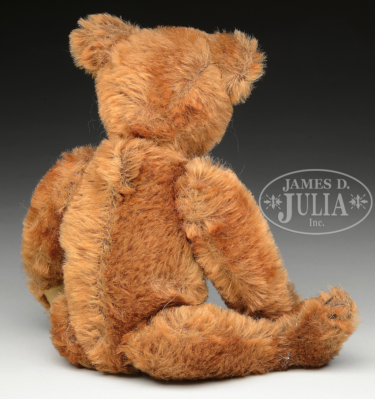 This charming bear is five-ways jointed and made from cinnamon colored mohair, making him quite desirable from the collector’s standpoint. With tan pads and five shaped paws, long and narrow feet and a pronounced back hump. Stuffed with a combination of kapok and excelsior. Teddy’s face is detailed with a trimmed muzzle, black shoe button eyes and a black hand-embroidered nose and mouth. His stitching has gently faded to shades of brown over time. Retains his original trailing “F” button as his Steiff ID. SIZE: Overall 10″ (25cm). Sitting: 7″ (18cm). CONDITION: Dusty paws, possible augmentation of stuffing in torso area and home-style restitching of back torso seam. Otherwise very good. 1-14271 (2,500-4,000) – Lot 3122b