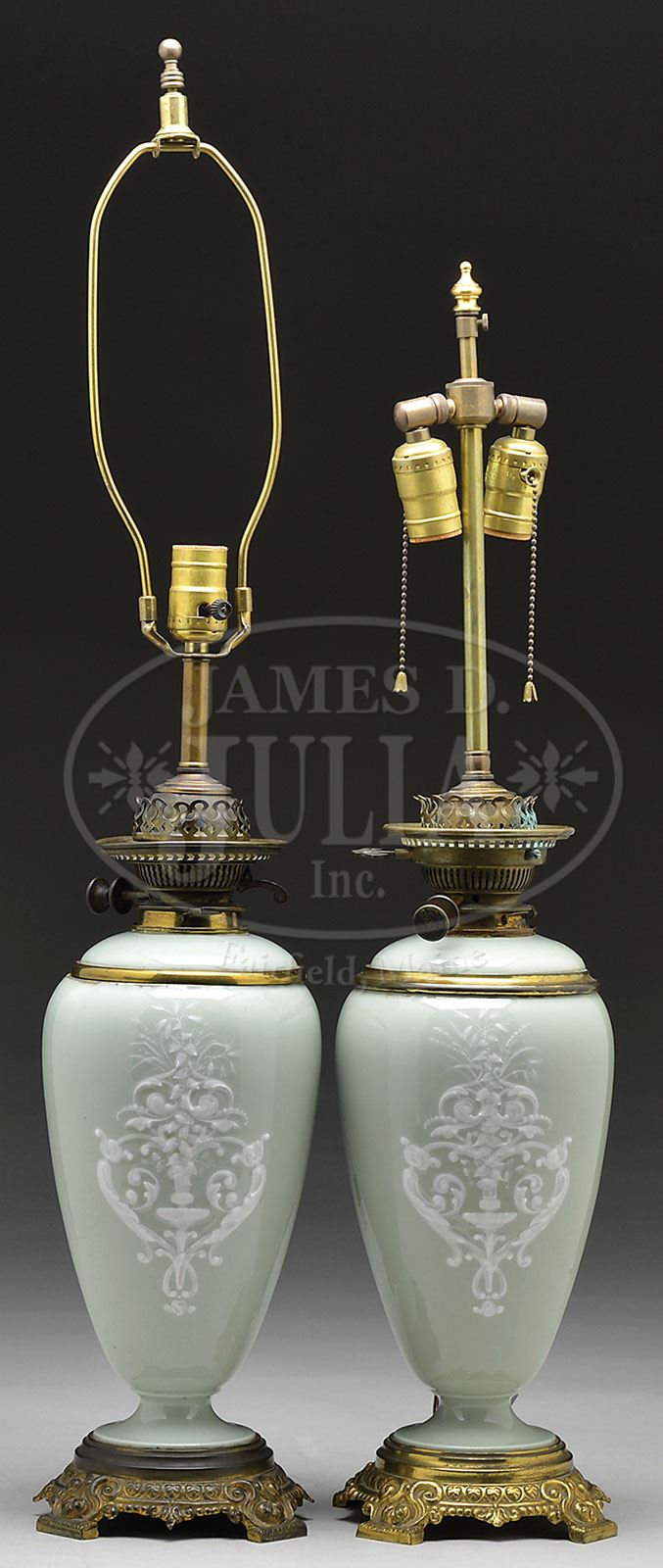 PAIR OF CELADON GROUND, PATE-SUR-PATE LAMPS. Late 19th century neoclassical motif pate-sur-pate, celadon ground vasiform porcelain lamps with gilt brass mounts, retaining Hinks Lever No. 2 burners. SIZE: 16-1/2″ to top of burner; 34″h to shade finial. CONDITION: Drilled through and electrified, with some wear to gilt, otherwise, in very good condition. 9-90060 (1,000-2,000)
