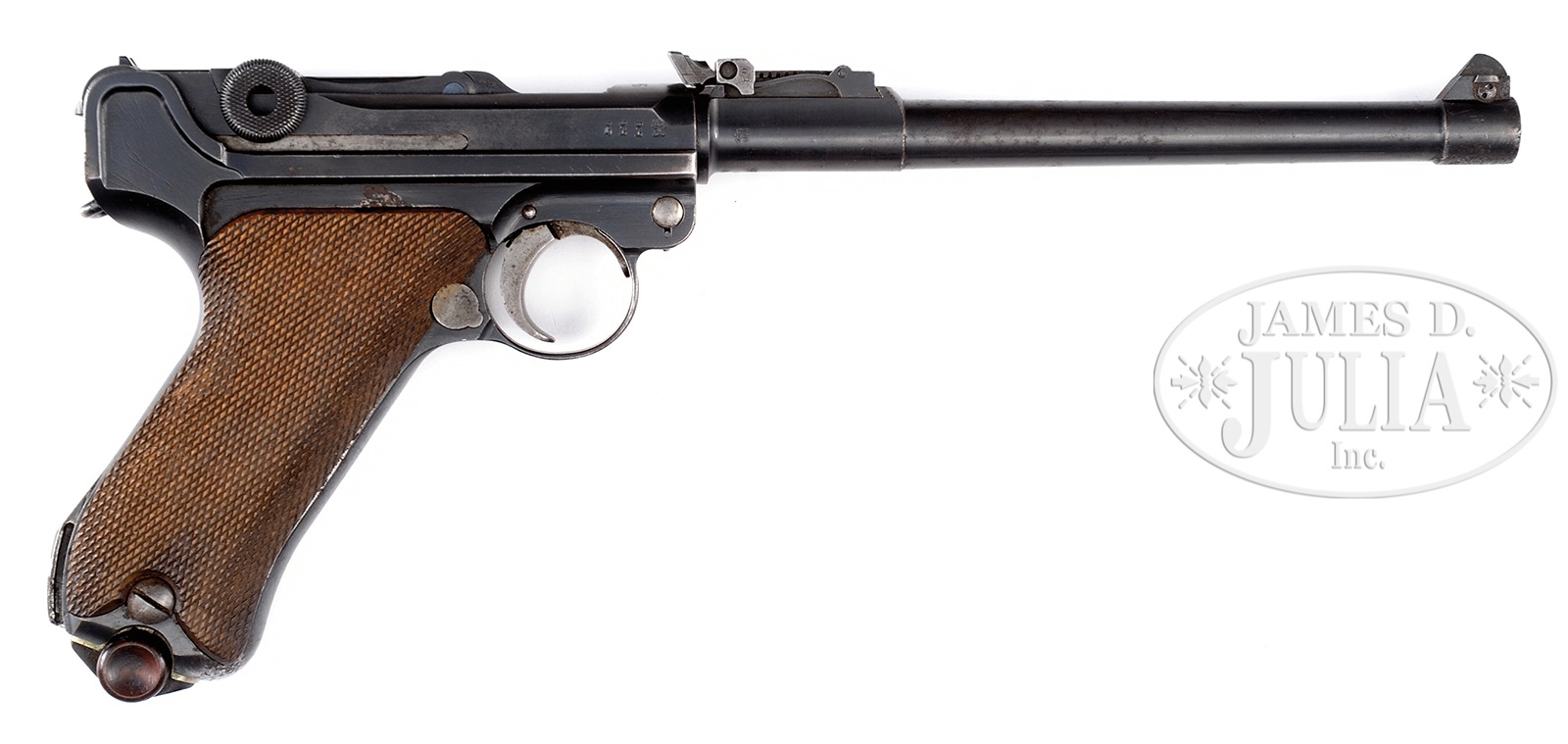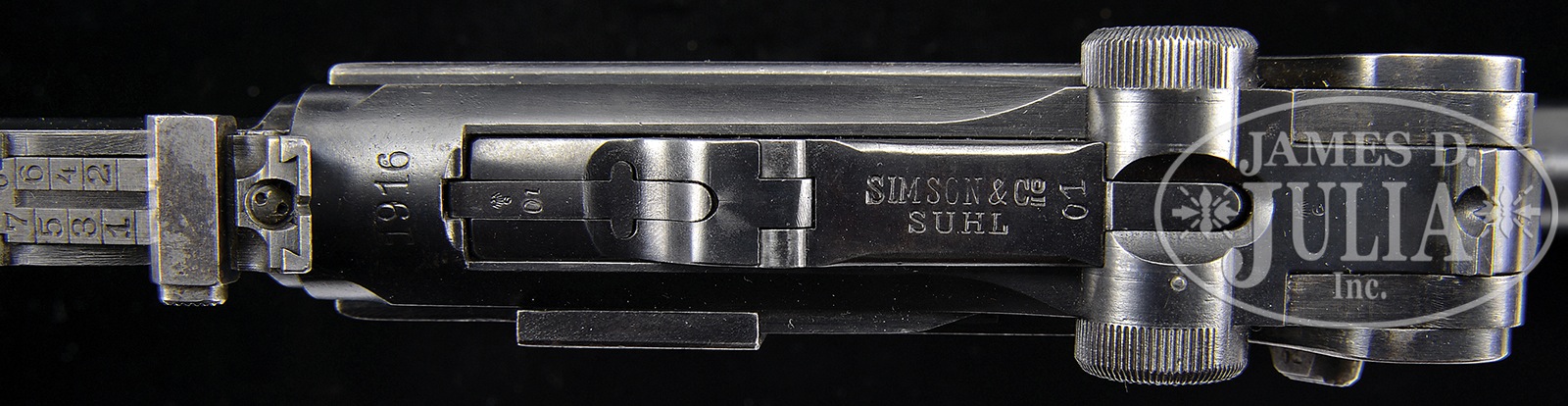 *◊ SIMSON REWORKED ARTILLERY LUGER.SN 9301a. 8″ 9mm artillery bbl with fine tune front and rear adjustable sights. “1916” above chamber. “SIMSON & Co/SUHL” marked on center toggle link. Imperial proofs on right receiver. Originally a 1916 DWM, this gun was reworked by Simson and has a Simson toggle assembly and sideplate that were replaced and numbered to the gun and Eagle/6 proofed. All numbered parts on the gun are matching, except for the holdopen which is “03”. The correct style numbered wood bottom magazine is numbered “6609”. This gun is featured on p. 976 of Dr. Geoffrey Sturgess’ The Borchardt & Luger Automatic Pistols. PROVENANCE: Collection of Dr. Geoffrey Sturgess. CONDITION: Very fine retaining 95% original blue and 40% original straw. Gun has some scattered pitting on the left side of the bbl, above the right grip, and at the bottom of both gripstraps and stock lug. Bore is lightly pitted. Checkered walnut grips are moderately worn. Magazine is excellent. Mechanics are sound. 43475-704 BWS80 (2,000-3,500) C&R – Lot 3123