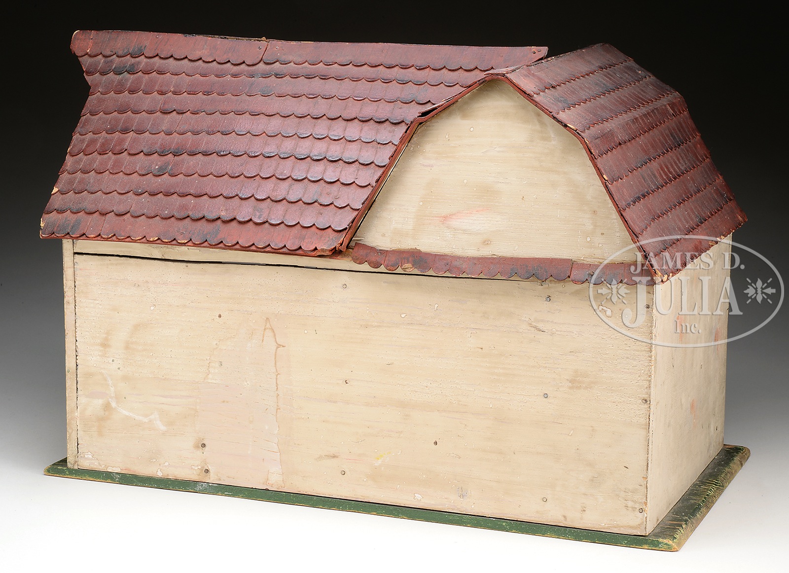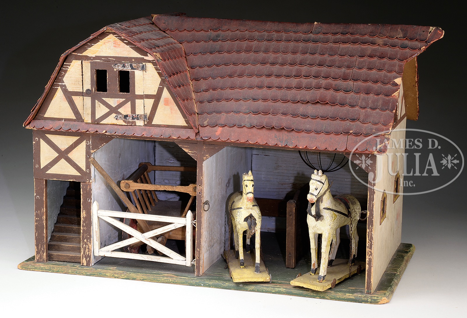 FOLK ART CARVED AND PAINTED BARN WITH HORSES AND HAY WAGON.The open sided barn having stalls for two horses, which are present. The horses are simulated pull toys mounted on base with wheels. An angle slatted hay wagon is seen behind white gate. Stairs lead up to the hay loft with floor door. Shingled roof. SIZE: 14″ h x 21-1/2″ w x 11-1/2″ d. CONDITION: Some loss to paint and some nicks and chips. Very good. 49371-6 (400-600) – Lot 3126