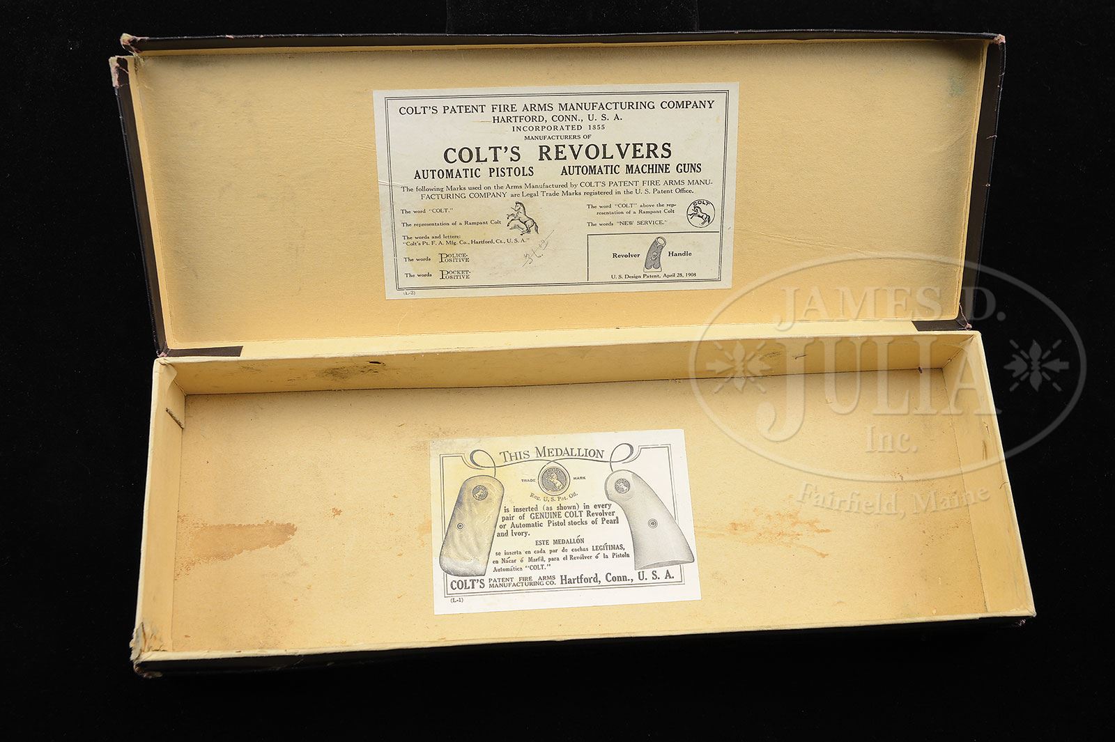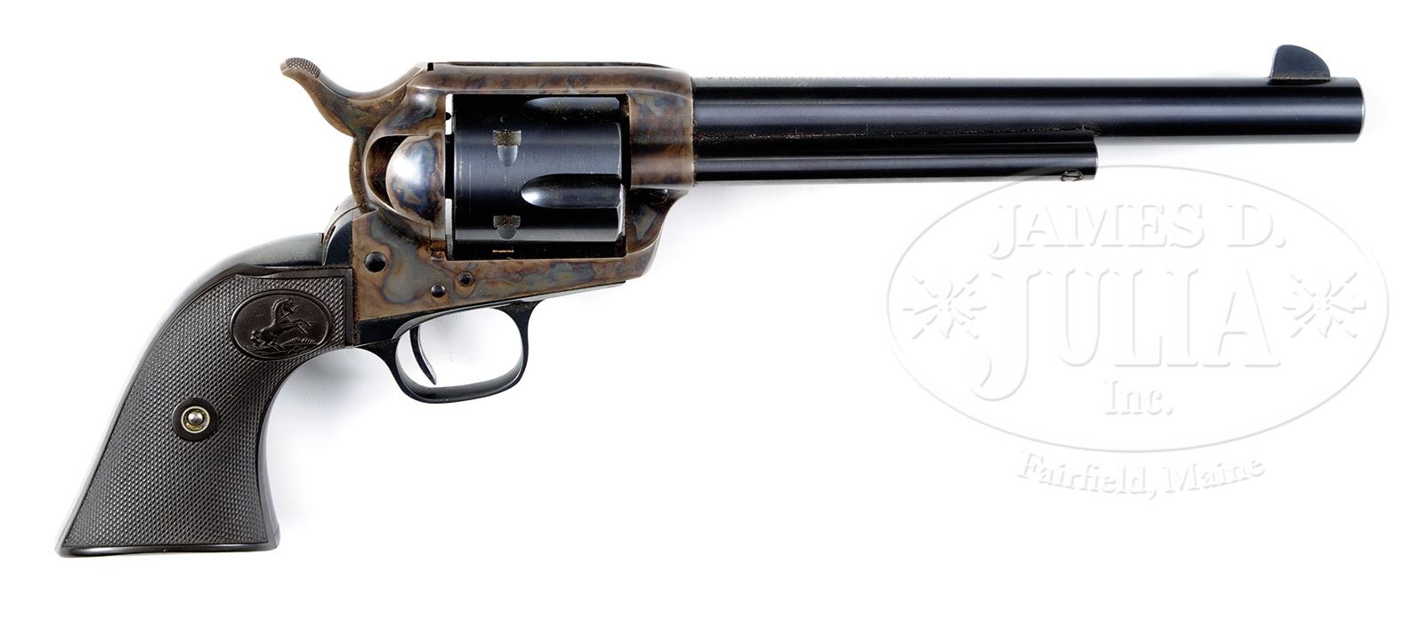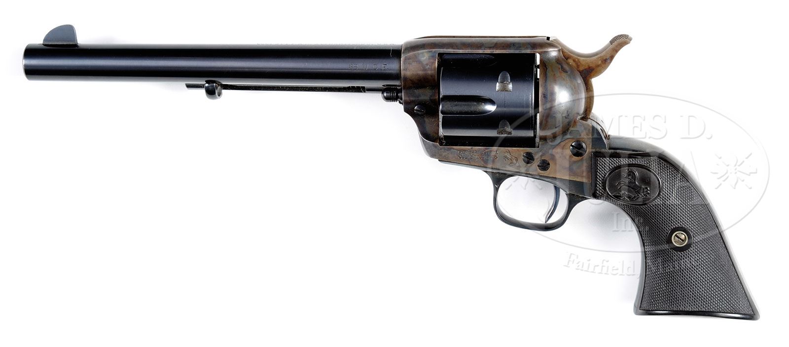 Please note: The caliber is actually “38 W.C.F.” (38-40), not 38 Spcl (special) as shown in the catalog. *PRE-WWII COLT SINGLE ACTION ARMY REVOLVER WITH ORIGINAL BOX.SN 346211. 38 Cal. Spcl. Blue & color case hardened with 7-1/2″ bbl, full thick front sight and 1-line block letter address with model & caliber marking on left side. Left side of frame has 2-line 3-patent dates and Rampant Colt. Mounted with Rampant Colt hard rubber grips matching numbered to this revolver. SN 346211 (mfg 1923) was observed on bottom of the frame and right side of front & back straps under the grip. Accompanied by its orig, matching numbered, hinged lid, dark burgundy cardboard box with black & white end label. Inside of box has 2 pasted advertising labels along with small Colt 4-pg pamphlet. This gun orig sold new April 26, 1924 for $34.52. PROVENANCE: Delores Demoth, Great Fall, MT. Lewis Yearout 1973. Estate Collection of Lewis & Leyton Yearout. CONDITION: Extremely fine plus, all matching, pristine, new & unfired. Retains all of its brilliant orig finish. Appears to be new & unfired and unturned. Box is sound and solid but one corner is broken and has glued repair, several pieces of veneer are missing, scattered scuffs and scrapes. 4-53928 JS48 (4,000-6,000) – Lot 3128 Click here to view provenance