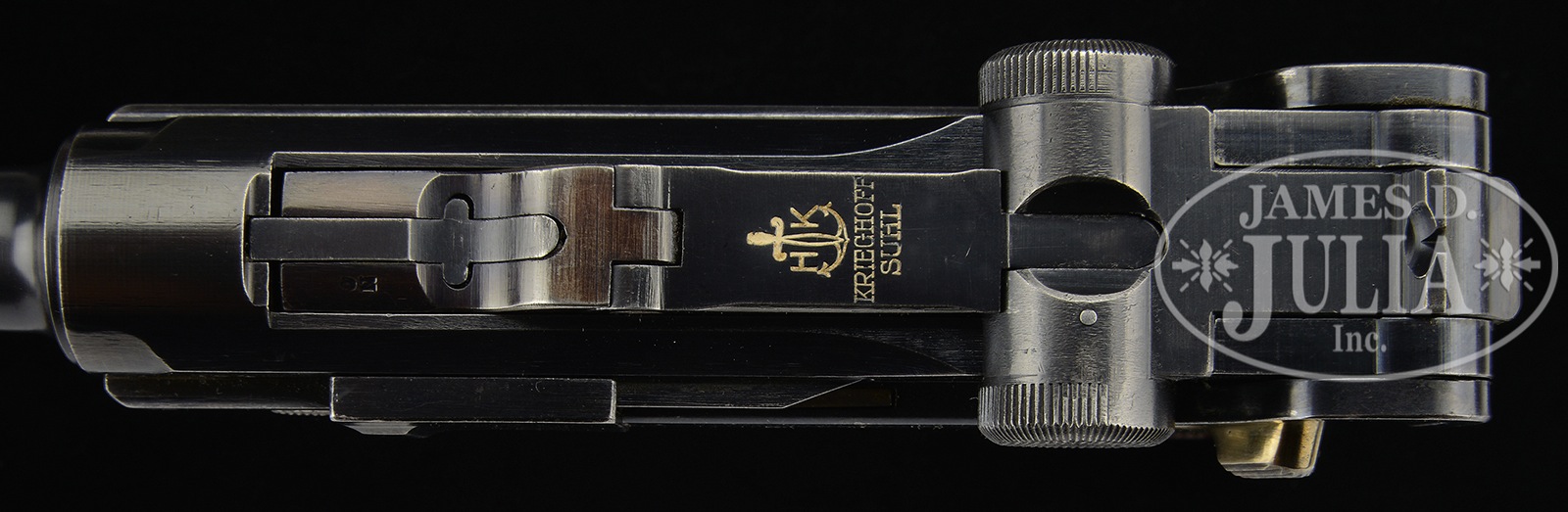 *◊ RARE KRIEGHOFF SIDE FRAME P CODE COMMERCIAL.SN P691. Cal. 9mm. 4″ bbl with small Crown/N proof on bottom. “HK/KRIEGHOFF/SUHL” in anchor logo on center toggle link. Eagle/2 proofs on toggle assembly. Partial star stamped on right receiver. Small Crown/N proofs on left receiver and left frame. Left frame is marked “Heinrich Kreighoff/Waffenfabrik/Suhl”. P prefix on SN on front of frame. Numbered parts on gun are matching. Checkered brown plastic grips with border. Brown plastic bottom Swiss magazine with “P” on spine and Swiss Cross proof on plastic bottom. PROVENANCE: The Friedrich-Wilhelm Dauphin Collection, Germany. CONDITION: Excellent, retaining 95% bright orig blue. Minor fading towards muzzle on sideplate and on rear grip strap. Strawed parts have been reheated to 95%. Right side of magazine release button retains 95% bright fire blue. Grips are bright and sharp. Bore is bright and sharp. Magazine has very little wear. Mechanics are fine. 49828-191 BWS (7,000-14,000) C&R – Lot 3131