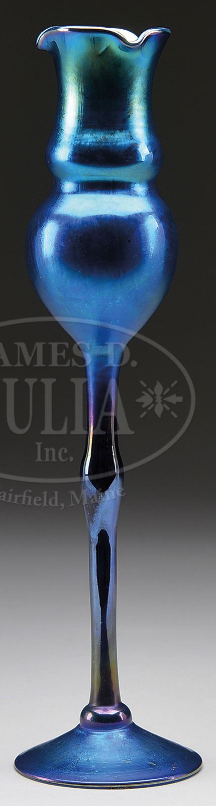 BLUE IRIDESCENT FLOWER FORM VASE.Flower form vase has blue iridescent inverted saucer foot and double gourd body with slightly flaring ruffled rim. The stem of the flower form is cobalt blue glass and the interior of the vase is gold iridescence with red highlights. Signed on the underside with spurious “L.C. Tiffany-Favrile 4275F”. The vase also carries a spurious Tiffany Favrile paper label. SIZE: 11-1/4″ t. PROVENANCE: James Boma Collection. CONDITION: Very good to excellent. 5-69666 (1,000-1,500) – Lot 3135