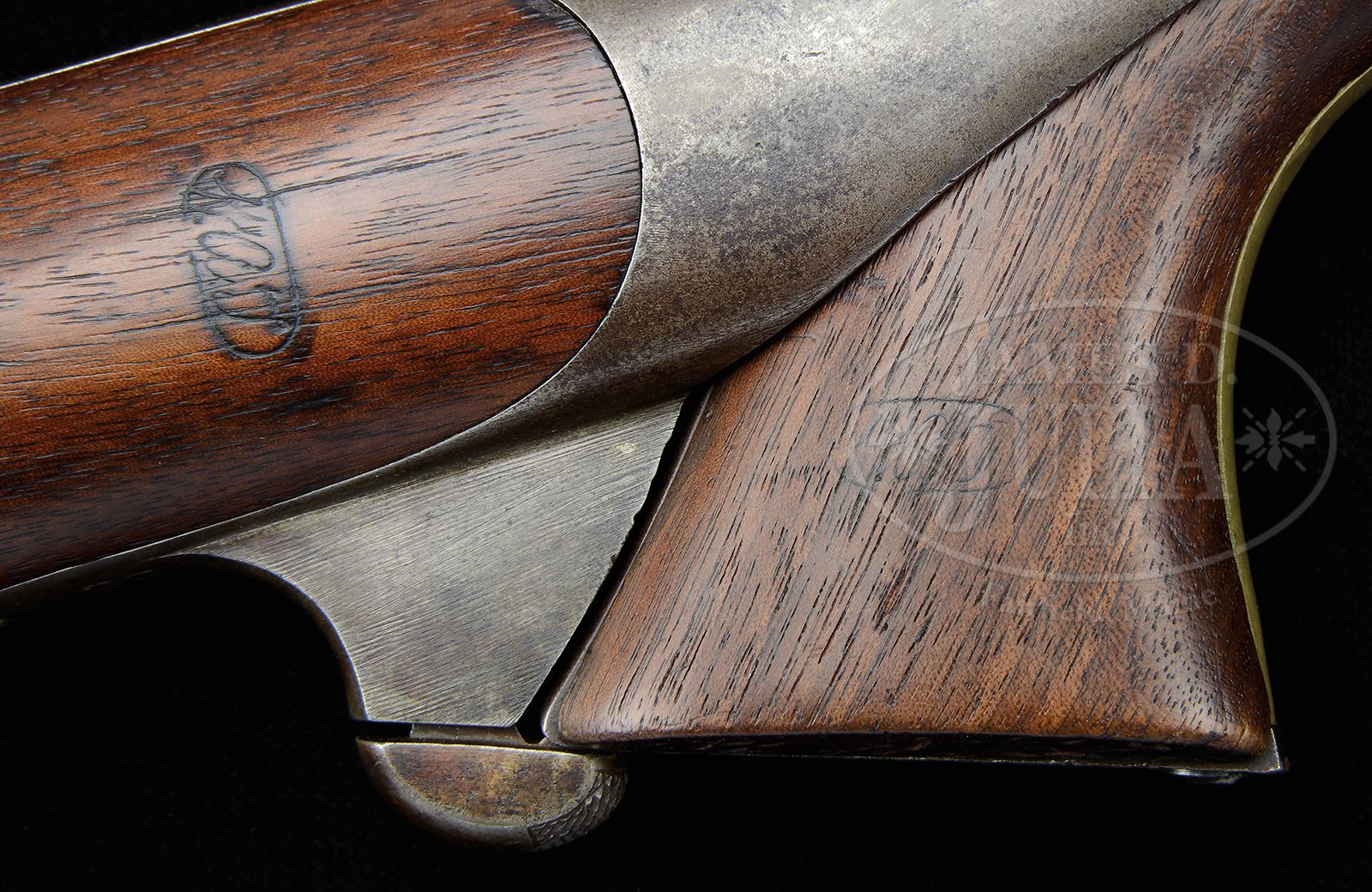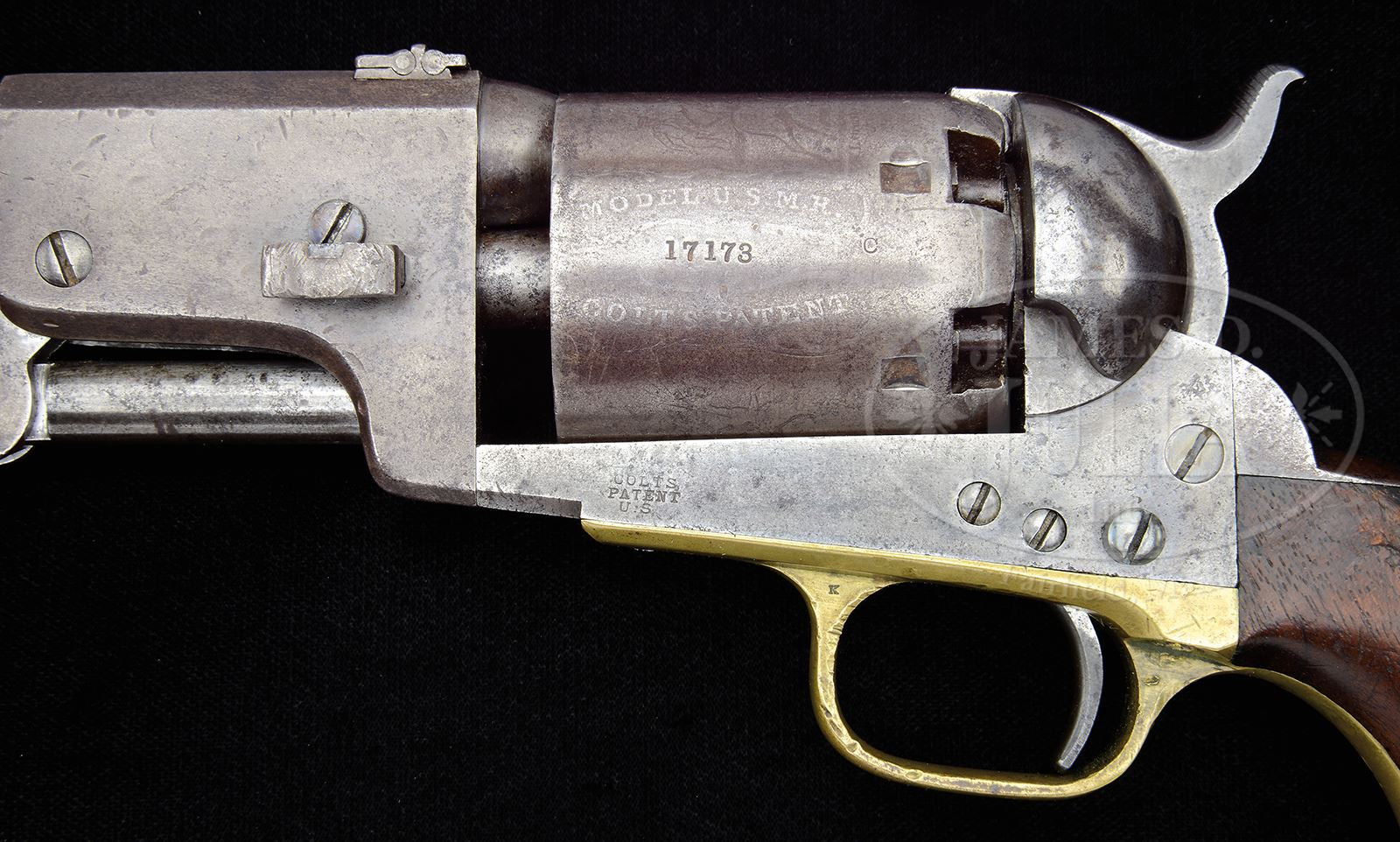 RARE MARTIAL COLT THIRD MODEL DRAGOON PERCUSSION REVOLVER WITH SHOULDER STOCK.SN 17173. Cal. .44. Usual configuration with 7-1/2″ oct to rnd bbl, slightly altered nickel silver front sight and 1-line New York City address. Top flat has a 1-standing, 2-folding leaf sight. Frame has small “COLTS PATENT” over a tiny U.S. Frame is 4 screw type cut for shoulder stock with flat head hammer screw and extended stock screws. Cyl has the Ormsby Dragoon/Indian Fight Scene roll marking and “MODEL U.S.M.R.” and “COLT’S PATENT” cartouches around the SN. The brass trigger guard and iron backstrap contain a 1-pc walnut grip with last 4 digits of matching SN in backstrap channel. Right side of grip has a thin but legible “WAT” (William A. Thornton) sub-inspector cartouche. Left side has the outline of a cartouche and there are small inspector initials on the various parts. Accompanied by an orig 3rd type Dragoon stock with iron mounts and walnut buttstock that has a crisp “MM” cartouche on the left side and “WAT” on the right side. Bottom tang of the iron yoke has the SNs 17433 & 17434 with identical SNs on buttplate tang. Bottom tang also has a stud and ring. There was a total production of about 10,500 of this model revolver produced 1851 – 1861 of which only 946 were ordered as “Pistol Carbines”. As the SNs on the buttstock indicate they were intended to be issued in pairs to mounted Dragoons. They are rarely found today with their numbered pair and matching stocks are very rare. PROVENANCE: The Estate Collection of Phil A. Bleakney, Jr. CONDITION: Fine, all matching except buttstock, as noted. Frame retains traces of dark case colors in the most sheltered areas otherwise the metal is a smooth, even gray/brown patina. Cyl is matching patina and shows 50-60% Dragoon/Indian Fight Scene roll marking. Cartouches surrounding SN on the cyl are completely legible. Trigger guard has a series of dents on the frontstrap and shows a medium to dark mustard patina. Top of backstrap also has some small dents and the buttstrap & bottom edges of grip are somewhat battered. Grip has a chipped right toe & shows a smooth hand worn patina. Mechanics are fine. Bright shiny bore with scattered pitting. Stock yoke & buttplate are matching patina to the revolver. Buttstock is sound with a hand worn patina. 49059-56 JR (10,000-15,000) – Lot 3135
