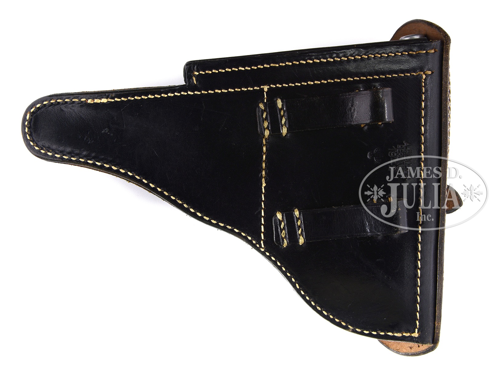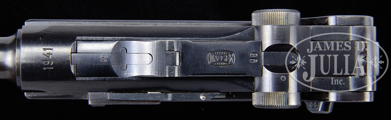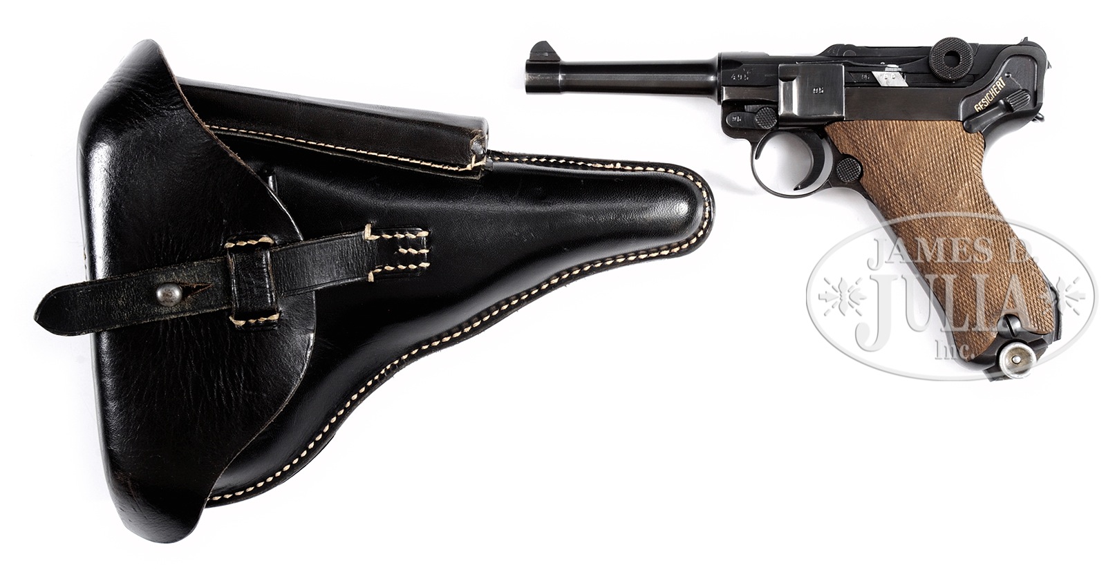 *EXCEPTIONAL MAUSER BANNER 1941 POLICE EAGLE L LUGER & RIG WITH TWO MATCHING MAGAZINES.SN 495y. Cal. 9mm Parabellum. Extraordinary Mauser Banner Luger, “1941” chamber date, with 4″ bbl, drift adjustable front sight and fixed rear sight. Mauser banner on middle toggle link. Full SN and letter suffix on forward frame with full SN repeated on left receiver. Unnumbered bbl marked with bore diameter. Eagle “L” proof on right side of receiver with sear safety. Fitted with full checkered walnut grips that are unnumbered. Accompanied by two matching numbered magazines in an “A. FISCHER / BERLIN C.2 / 1942″ marked orig black leather holster. The #2 magazine is a “HAENEL SCHMEISSER PATENT” & the other a standard magazine. No takedown tool. A nicer, as issued, WWII German Police Luger rig would be extremely difficult to find. PROVENANCE: Ex Doug Smith Collection. The William Smith Collection. CONDITION: Extraordinarily fine, all matching including two magazines & grips. Approx 98-99% crisp orig salt blue excepting around stock lug where there is a small area of discoloration. Sear safety pin is correctly in-the-white. Grips are very sharply checkered with minimal oil discoloration. Excellent condition magazines with the #1 magazine having been lightly cleaned above the follower button. Near mirror bore. Perfect manual mechanics. Outstanding holster with orig white stitching showing no evidence of repolishing or staining. 50600-6 (6,000-8,000) C&R – Lot 3136