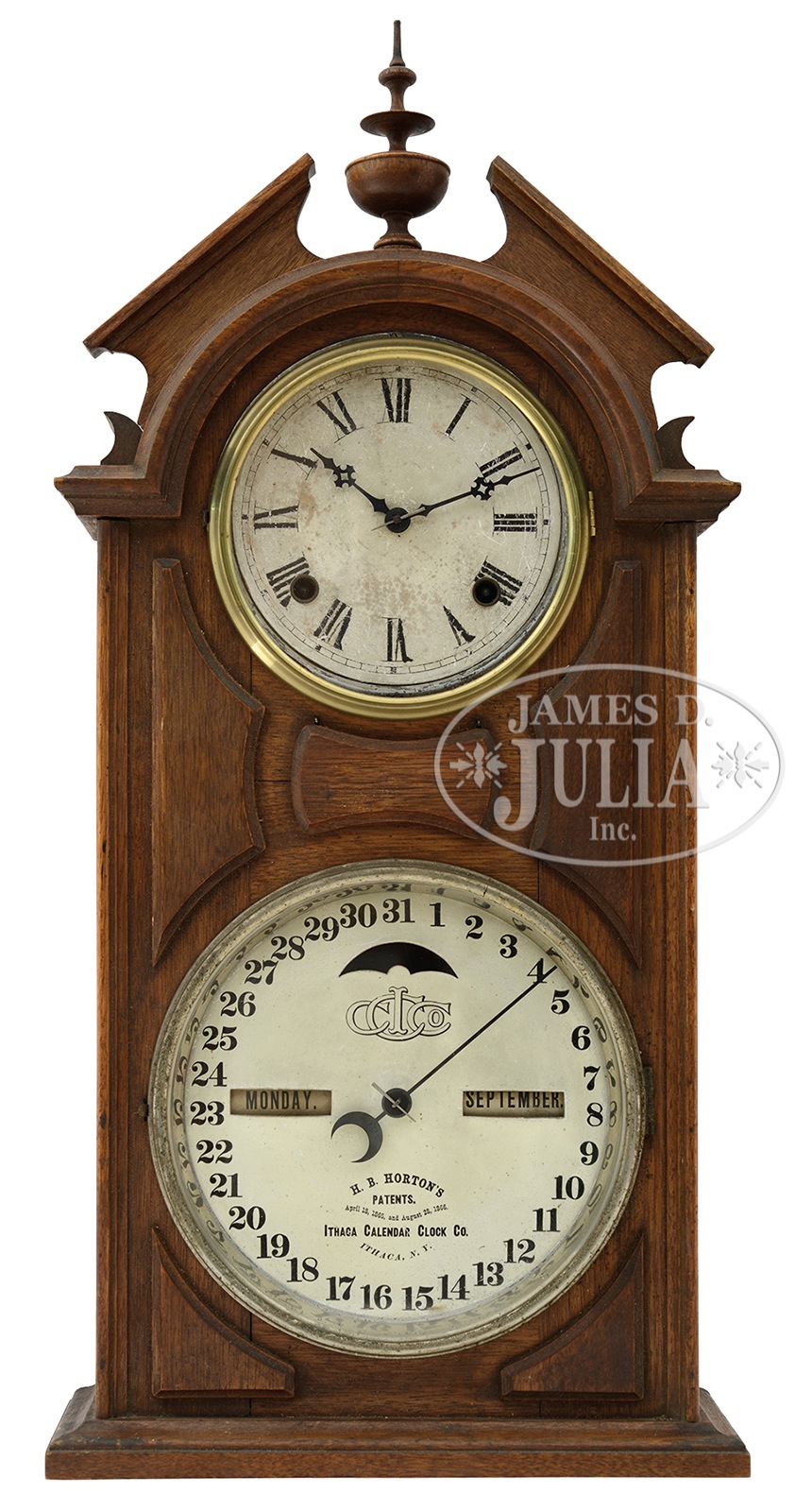Circa 1870, patented 1866 Ithaca Clock Company, Ithaca, NY. The walnut domed case applied with burl panels. The edge molded, the upper dial with Roman numeral chapter ring and time strike apparatuses, above the secondary dial with 31 day outer ring and apparatuses for the day of the week and month of the year. The original dial face with company logo above, “H.B. Hortons Patent/April 18, 1865 and August 28, 1866/ Ithaca Calendar Clock Company/Ithaca, N.Y.”. SIZE: 25” h x 11-1/2” w x 4-1/2” d. CONDITION: With original old finish, overall generally good. Original dials. 49421-90 (750-850) – Lot 3137
