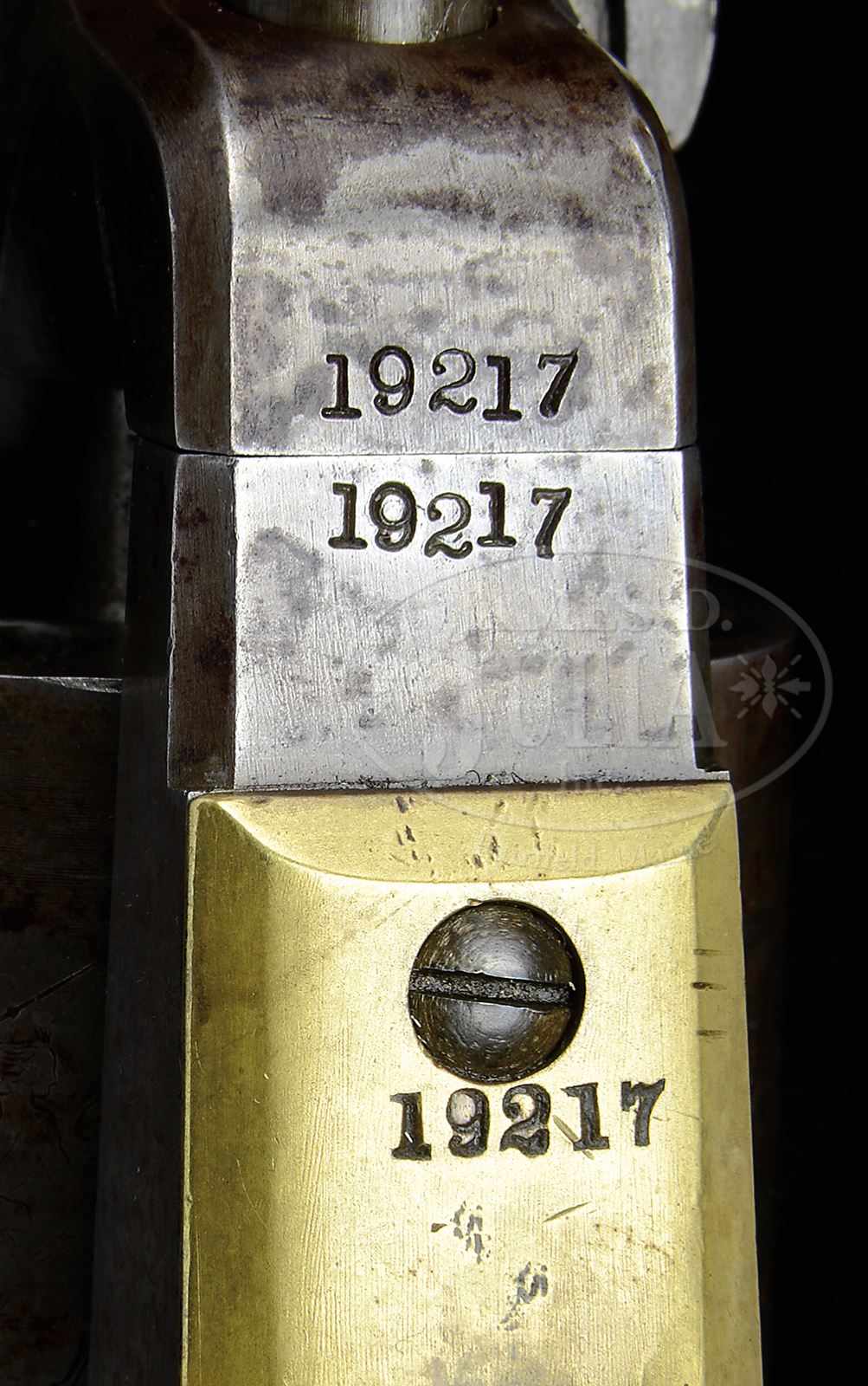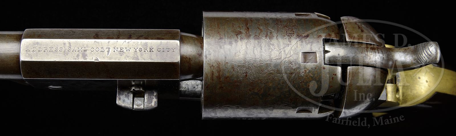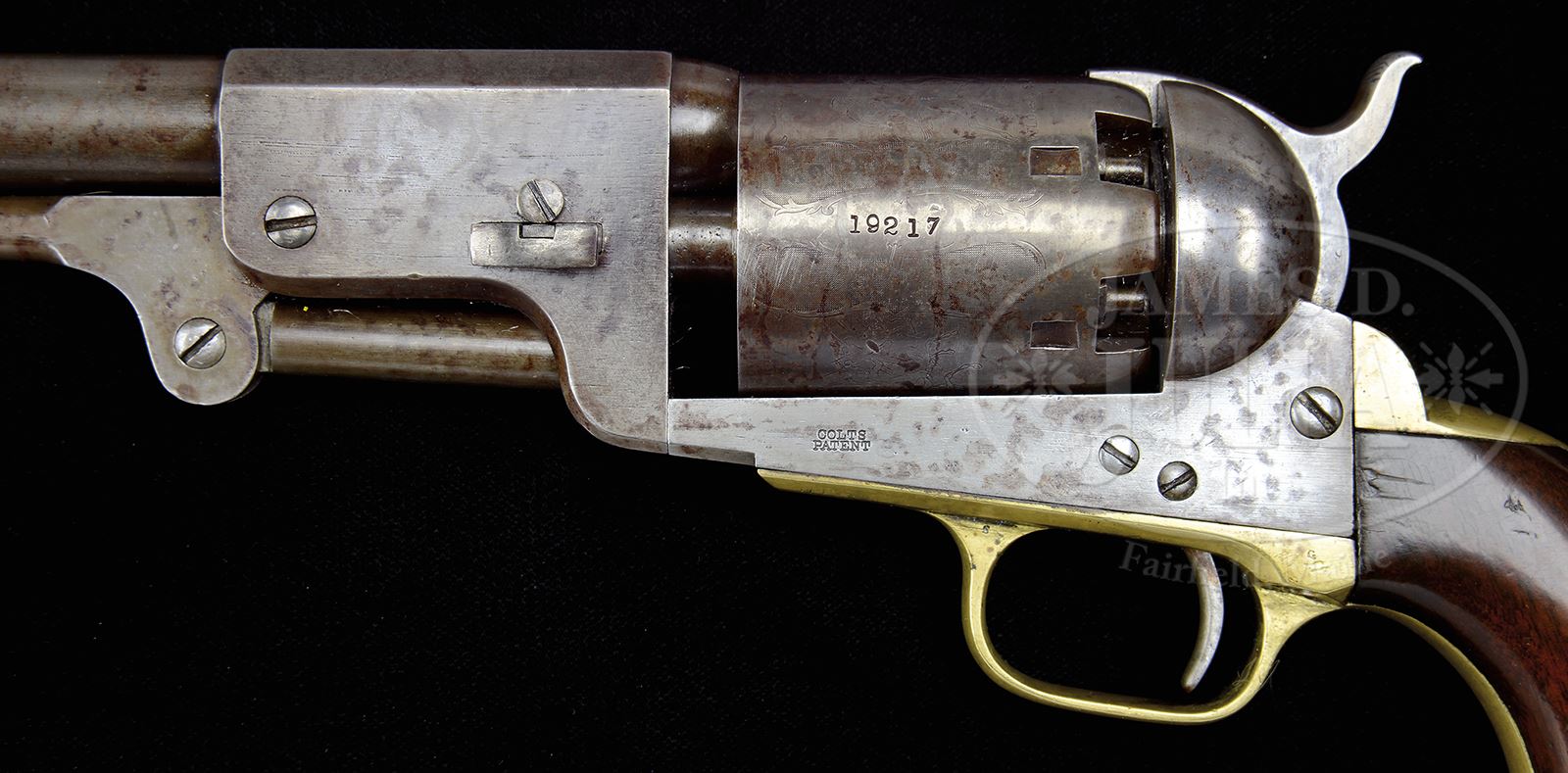 Please Note: In further researching this gun we sold this gun in 2004 and 2005. At that time there was no cylinder seam and markings were weak all of which have been re-rolled or enhanced since. SCARCE COLT 3RD MODEL DRAGOON PERCUSSION REVOLVER WITH 8″ BARREL.SN 19217. Cal. 44. Usual configurations with 8″ oct to rnd bbl, slightly altered silver nickel front sight and 1-line New York City address. Left side of frame has a small COLTS PATENT. The silver plated brass trigger guard & backstrap contain a varnished 1-pc walnut grip with last 4 digits of matching SN in backstrap channel. Cyl has the Dragoon-Indian fight scene roll marking with the “MODEL U.S.M.R.” and “COLT’S PATENT” cartouches faintly above & below the SN. There were about 10500 3rd Model Dragoon revolvers produced in the period 1851-1861, very few of which had the 8″ bbl. Having been produced just at the onset of the Civil War, it is almost with certainty that one could state that this revolver saw service during the Civil War and later on the American frontier. These revolvers, although large and heavy were still popular for their stopping power and longer range shooting. This revolver has 3-screw frame not cut for shoulder stock. Few of these revolvers survive, especially those with 8″ bbls. PROVENANCE: The Estate Collection of Phil A. Bleakney, Jr. CONDITION: Very good, all matching including wedge, cyl & grip. No orig finish remains, being an overall smooth grey/brown patina with scattered nicks & scratches and light surface etching. Cylinder is matching patina and shows 75-80% Dragoon-Indian fight scene roll marking with faint cartouches. Trigger guard & backstrap show an old cleaning with medium mustard patina. Grip has a chipped left toe, otherwise is sound with light edge wear and retains most of an old restored finish. Mechanics are fine. Strong bright bore with fine pitting. 49059-57 JR (7,000-10,000) – Lot 3138