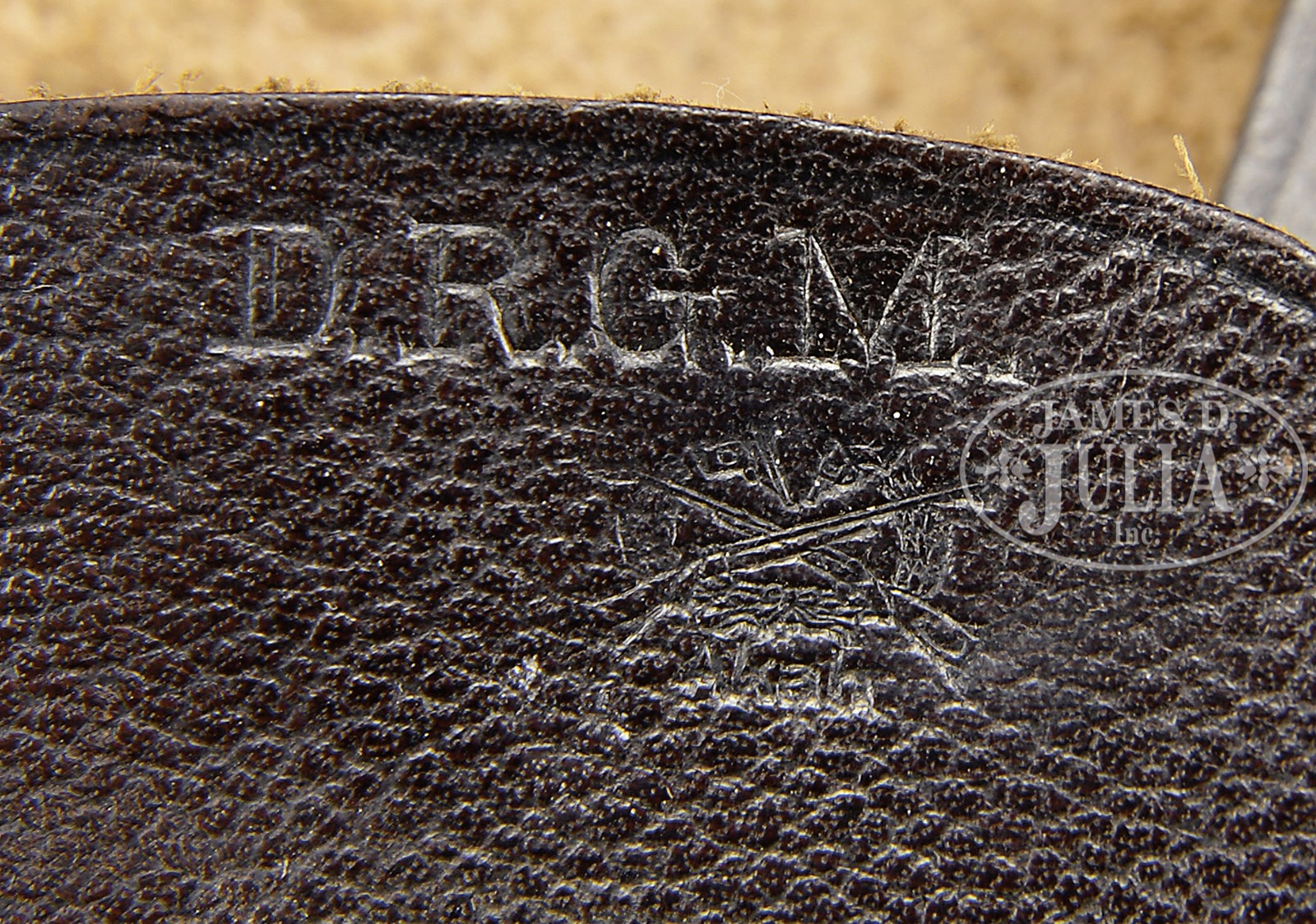 FABULOUS SA MARKED SAUER 38H HOLSTER.SN NSN. Dark brown leather. SA logo stamped onto flap. Upstrap with flat stitched top. “D.R.G.M.” above “Akah” crossed rifles logo behind strap. Inside of flap has illegible name of a GI ending with “US Army” above “Sauer 7.65” in blue ink. PROVENANCE: Collection of Dr. Geoffrey Sturgess. CONDITION: Excellent orig condition with very little wear. Only very minor scuffs and surface cracking at top. Almost near new condition. Leather retains 98% orig bright finish. All stitching intact and orig color. Structure is solid. 4-53351 BWS115 (1,500-3,000) – Lot 3140