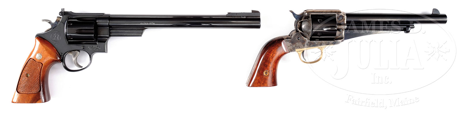 *LOT OF TWO MODERN HANDGUNS.1) SMITH & WESSON 29. SN BAR4129/J09586. Cal 44 Mag. Smith & Wesson Model 29-3 Silhouette DA revolver. Blue finish with 10-5/8″ ribbed bbl that has a special 4-position adjustable front sight and adjustable rear sight. It has target trigger & hammer and is mounted with S&W medallion Magnum grips. CONDITION: New and unfired. 2) UBERTI 1875 OUTLAW. SN J09586. Cal 45 Colt. Uberti Model 1875 Outlaw. Blue & color case hardened with 7-1/2″ bbl, full front sight and mounted with 2-pc smooth walnut grips. Trigger guard is brass. CONDITION: New and unfired with only faint cylinder line. Grips are equally new. 51567-6, 51567-7 JRL (1,000-1,500) – Lot 3140