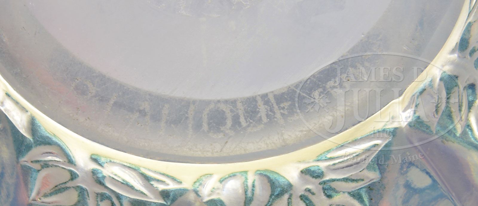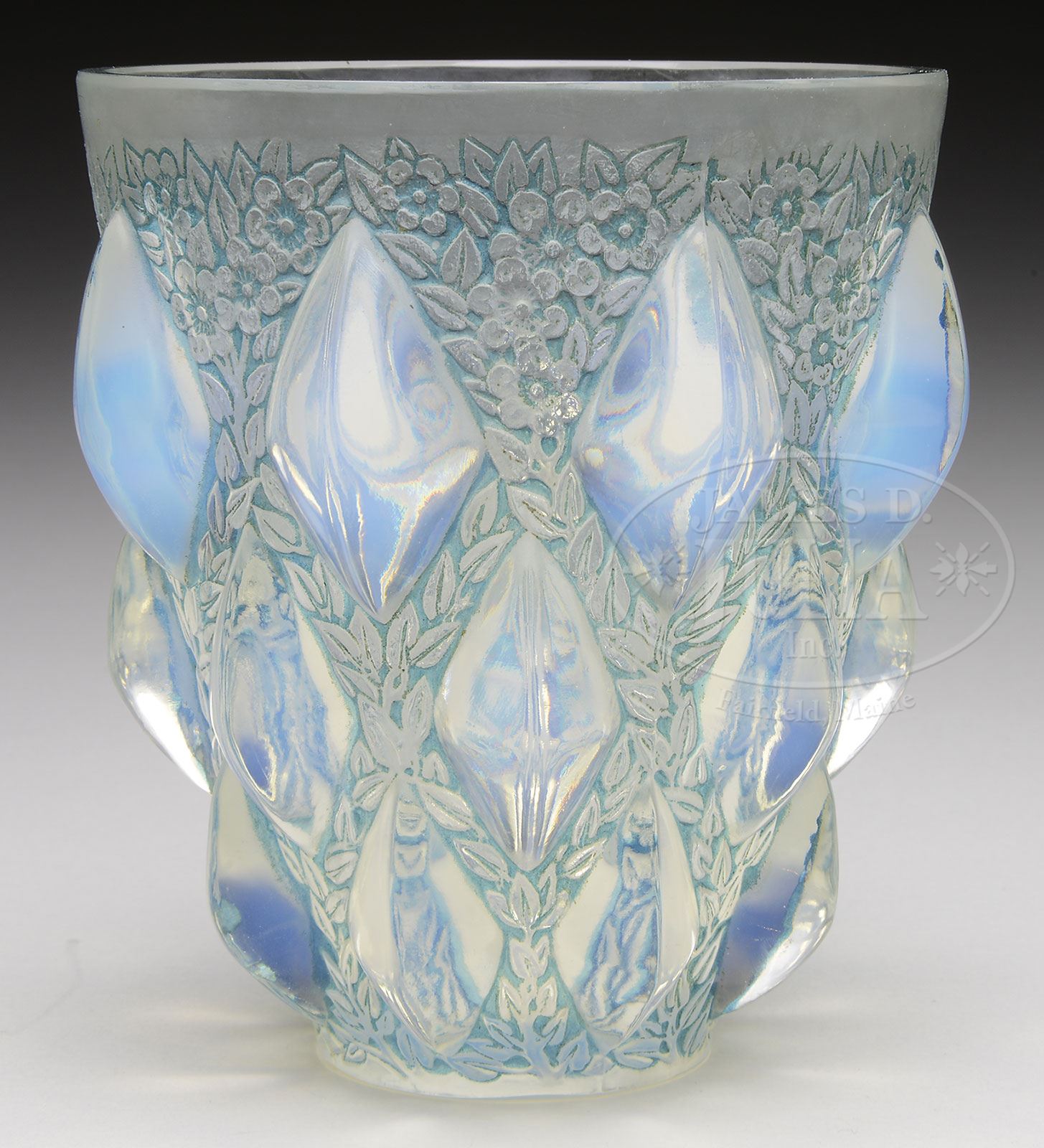 R LALIQUE RAMPILLON VASE.R. Lalique vase is decorated with three horizontal rows of raised opalescent diamond shaped cabochons. The cabochons are surrounded by an all over impressed floral designs. Vase is finished with a green patination within the floral design. Signed on the underside with acid etched blocked letters “R. Lalique France”. This design is shown in the book R. Lalique Catalog Raisonne by Felix Marcilhac, pg. 437, photo #991. SIZE: 4-7/8″ t. CONDITION: Very good to excellent. 5-69333 (1,200-1,800) – Lot 3142