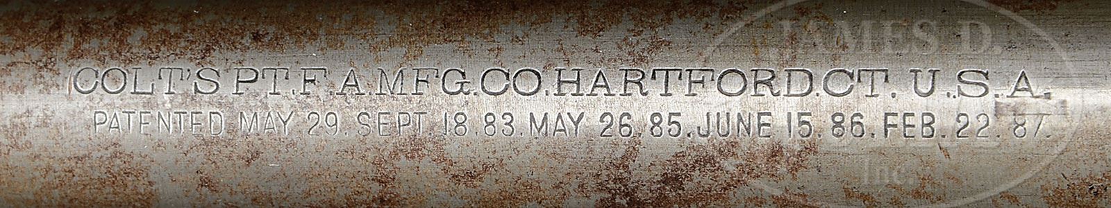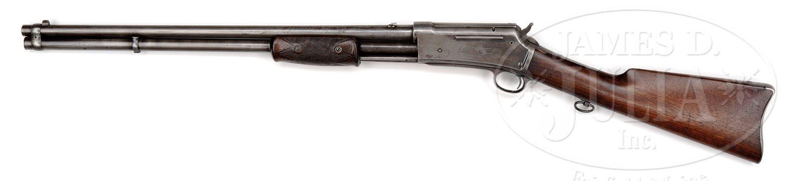 RARE COLT LIGHTNING LARGE FRAME PUMP ACTION BABY CARBINE.SN 969. Cal. 40-60-260. Standard grade carbine with 22″ light weight, tapered rnd bbl, full magazine, magazine band at the muzzle, barleycorn front sight and a Lyman 6A folding rear sight with one broken blade. Left side of receiver has the Rampant Colt roll marking. Bottom tang has a factory sling swivel and the magazine tube has a factory sling band, missing the swivel. Mounted with uncheckered American walnut buttstock that has smooth steel carbine buttplate. The 2-pc forearm is double Schnable with checkering. Weight just under 8 lbs. Accompanied by Mr. Yearout’s Collection inventory card which shows that he purchased this carbine in Jun. 1973 from Ron Lippold of Oshkosh, WI. Also accompanied by a copy of the orig bill of sale. According to various publications there were 6,496 large frame lightning firearms produced 1887-1894, of which very few were Baby Carbines. While these Colt rifles & carbines were very efficient, by the time they were in production the era of the heavy rifles was drawing to a close in favor of the lighter, handier lever action rifles. Lightning rifles never reached the popularity to make them a viable contender to the Winchester or Marlin lever actions. PROVENANCE: Estate Collection of Lewis & Leyton Yearout. CONDITION: Good. Traces of orig finish remain in the most sheltered areas being mostly a cleaned grey metal patina; stock has repairs by the top tang, otherwise the wood is sound showing heavy wear with light nicks & dings. Mechanics are fine; strong bright bore with light pitting. 4-53872 JR39 (4,000-7,000) – Lot 3142 Click here to view provenance