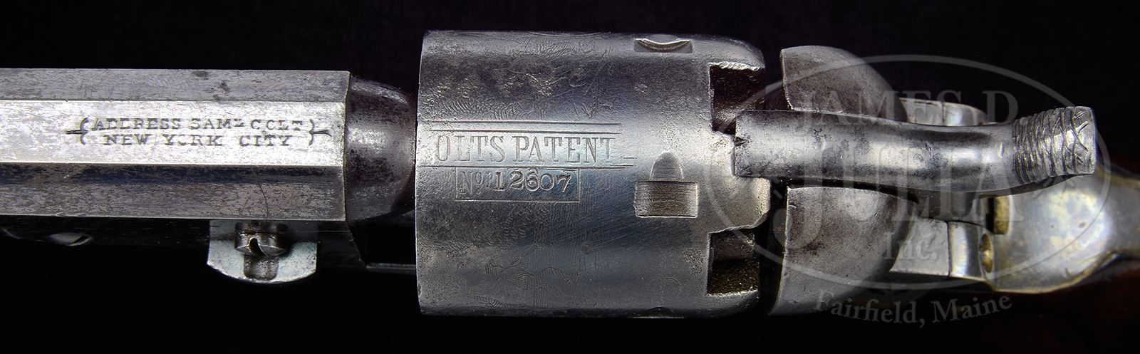 SN 12607. Cal. 31. This cased Colt Baby Dragoon was made in 1850 during last year of production in transition to the standard pocket models which these guns are sometimes referred as with squareback trigger guards. This gun conforms to other transitional Baby Dragoons with 4″ oct bbl and 2-line New York address. Gun has a typical 5-shot smooth cylinder with rolled stagecoach holdup scene, small “COLTS PATENT” stamped on left side of frame, several small cryptic or assembly numbers and letter found on left side of bbl lug, front web of trigger-bow and in rear of trigger guard. This is a well presented, fine Baby Dragoon with loading assembly in nice Colt casing with eagle flask, brass Colt mold, gun tool and caps. PROVENANCE: The Estate Collection of Phillip Bleakney. CONDITION: Gun is very good to fine overall retaining about 80% bright blue finish on bbl and traces of blue on cylinder with balance a silver/blue color which appears touched up with 80% plus cylinder scene with pitting. SNs are all matching other than there is no number on grips and wedge number is obscured and numbers visible do not match. Hammer screw is replaced. Frame, hammer and loading assembly have traces of muted case colors with balance silver/grey with light staining and pitting. Patent marking on left side of frame is light and several letters are not visible as can be seen in photos. Backstrap & trigger guard retain about 80% of their thinning orig silver plating. Grips are well fit with traces of orig varnish. Mechanically gun functions well with a crisp bright bore with very light pitting. Accompanying Colt casing is very good overall with about a 6″ crack in top lid of mahogany case. Brown velvet lining is soiled, stained & light faded. The 2-cavity brass bullet mold shows old cleaning and only partial “COLTS PATENT” markings. Double-sided eagle flask has traces of orig varnish, several small dents with mustard colored patina overall. Cap tin complete with green paper label. 49059-68 JS (5,000-8,000) – Lot 3142