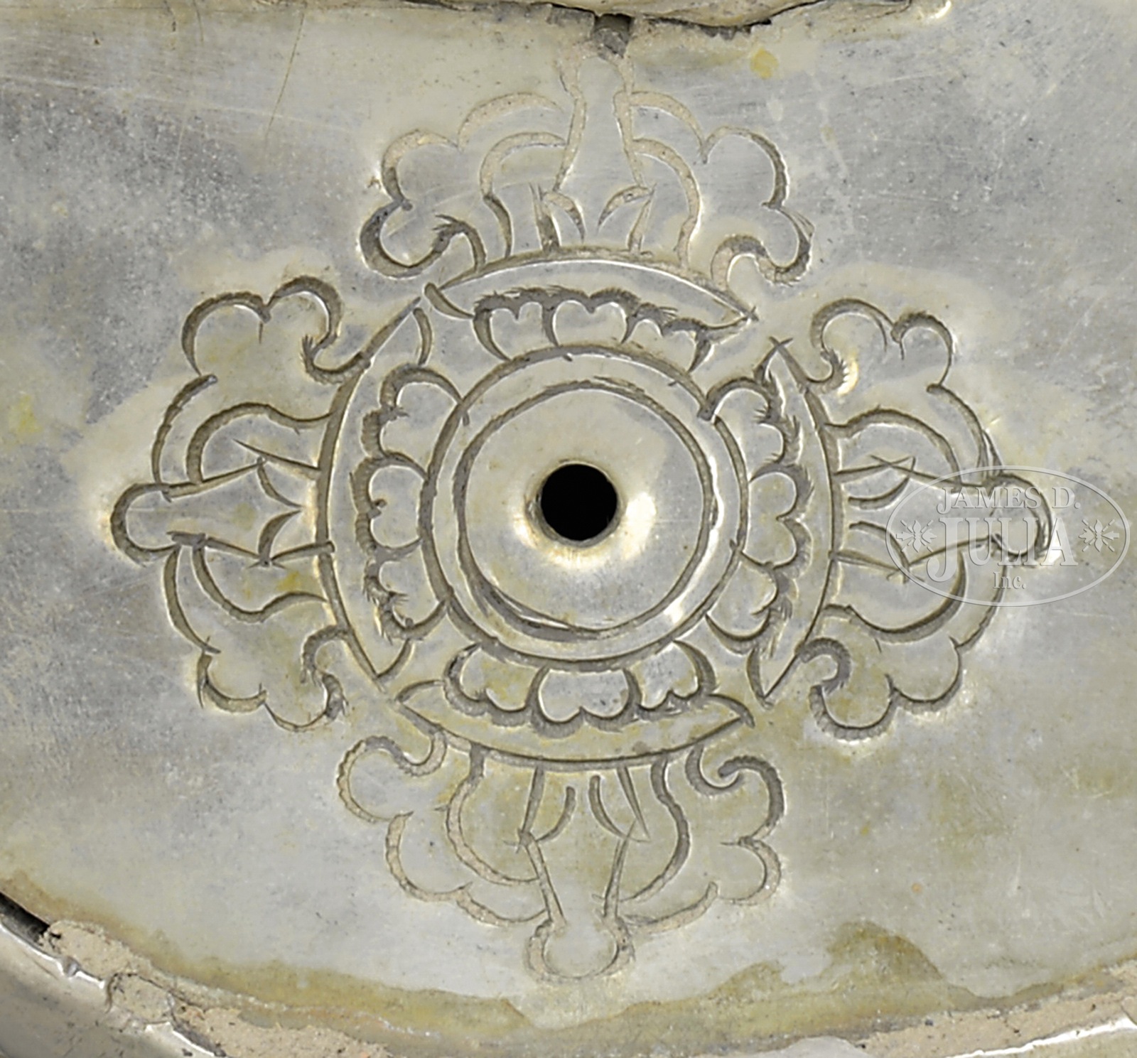 SILVERED COPPER ALLOY FIGURE OF KUBERA.19th/20th century, Tibet. Seated figure in base silver, copper and gilt. SIZE: 7″ h. PROVENANCE: The personal collection of Dr. Helga Wall-Apelt. CONDITION: Loss to an area of the crown. Otherwise good. 47671-190 (800-1,200) – Lot 3142