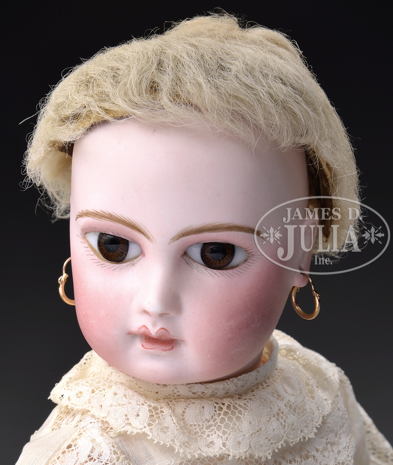 Please note: There is a slight hairline crack in the forehead, hard to see. EARLIEST PERIOD “PORTRAIT JUMEAU”.Early pale bisque head incised “0” at the base of the neck. She has the sought after almond shaped eye cuts with big brown paperweight eyes, closed mouth with V-shaped upper lip with slight space between lips and nice highlighting, mauve shading above upper eyelids, and pierced earlobes. Body is original with eight separate ball joints, the desirable cupped fingers, and bears the original patina. There is no mark on the torso. She retains the original sheepskin wig over cork pate and wears a simple white cotton and lace dress with antique white leather shoes. SIZE: 15-1/2″ t (39cm). CONDITION: Very good; slight uneven coloring on both cheeks. 1-14045 (5,500-7,500) – Lot 3144 Auction: Advertising, Toy & Doll - Spring 2014 Please Note: All prices include the hammer price plus the buyer’s premium, which is paid by the buyer as part of the purchase price. The prices noted here after the auction are considered unofficial and do not become official until after the 46th day. |