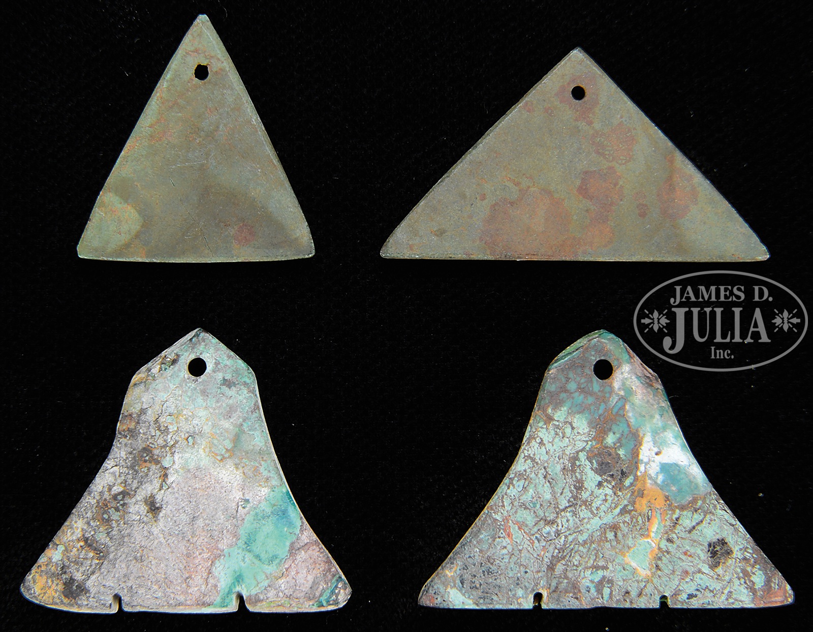 Age and origin unknown. Triangular shaped with linear engraving. Possibly earrings. SIZE: Each about 1″ x 1-1/4″. PROVENANCE: The personal collection of Dr. Helga Wall-Apelt. CONDITION: Surfaces patinated. 47671-309 (300-500) – Lot 3144