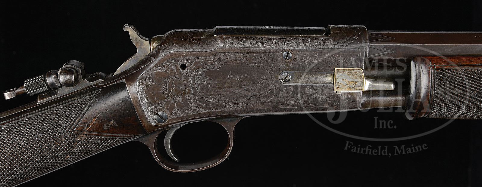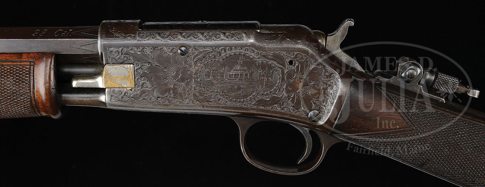 *RARE ENGRAVED DELUXE SMALL FRAME COLT LIGHTNING PUMP ACTION RIFLE.SN 75807. Cal. 22. Usual configuration with 24″ tapered oct bbl, half magazine, Marbles #6 front sight missing it’s bead, Lyman 6A 2-leaf rear sight and a Lyman combination tang sight. Mounted with checkered, slab-sawed American walnut with single Schnable forearm and straight stock that has Colt hard rubber buttplate. Receiver is beautifully period engraved in very elaborate style with full coverage on the receiver consisting of the vignette of a national capitol building that may be the U.S. Capitol with flag flying from the dome, a church building with two turrets on the right side of the Capitol Building and what is probably a parliament style office building on the left side. There is a fountain and pool in the foreground. Each end of this vignette is engraved with an elaborate flower blossom with leaves and all surrounded by incredibly fine foliate arabesque patterns. Right side of the receiver is similarly engraved with the vignette of an ocean going steam ship, a sail boat and small fishing boat with a small house on the shore in the left background. The nickeled brass loading gate is very nicely engraved also. Matching engraving patterns extend over the top of the frame and dustcover along with both top & bottom tangs. Bottom of the receiver is engraved with the small vignette of a body of water with hills in the background. Chamber area of the bbl is engraved with large “V” patterns. Left side of the upper tang, under the wood is marked with matching serial number. Buttstock has the number “6105” on it’s front edge. Bottom of the stock and bottom flat of the bbl have sling swivel stud screw holes. Accompanied by a Colt factory letter which identifies this rifle in caliber 22, bbl length not listed, blue finish and walnut stocks shipped to M. Hartley Co. / NY, NY on Mar. 24,1903 in a ten gun shipment. No mention is made of the checkered wood or engraving. Also accompanied by a copy of Mr. Yearout’s inventory record card which shows that he purchased this rifle in Apr. 1970 from renown dealer/collector James Goergen of Austin, MN. Another note from Mr. Yearout states that this rifle was reputed to have been purchased from the estate of Senor Fillippi Lopez Netto who was the Brazilian minister to the U.S. in the 1880s. PROVENANCE: Estate Collection of Lewis & Leyton Yearout. CONDITION: Fine. Bbl & magazine tube retain about 90% blue/brown finish with freckles & spots of light rust; receiver retains virtually all of its orig blue turned plum; stock is missing a couple of slivers near the top tang, otherwise wood is sound; stock, probably an old replacement retains most of its orig finish showing dulling from handling & use. Forearm is sound and retains most of its orig varnish. Mechanics are a little stiff but functional, bright shiny bore with a ring about 4″ from the muzzle that is only slightly visible on the outside. 4-53909 JR29 (5,000-8,000) – Lot 3146 Click here to view provenance