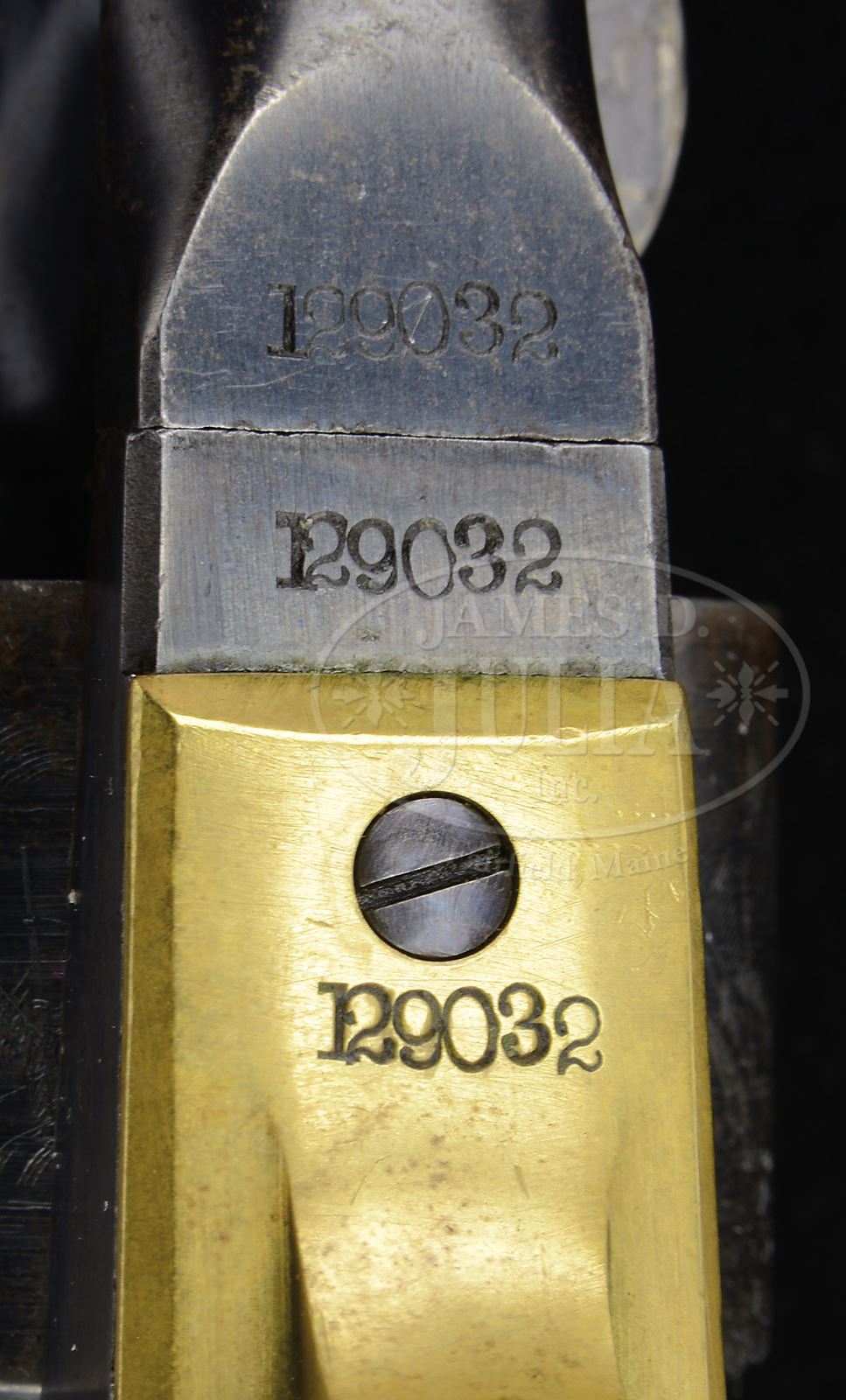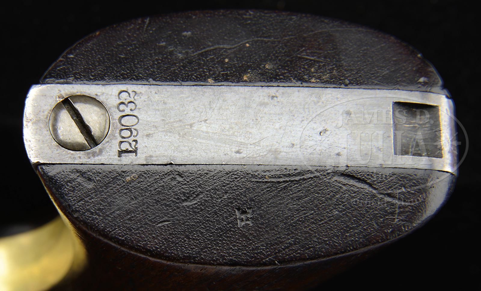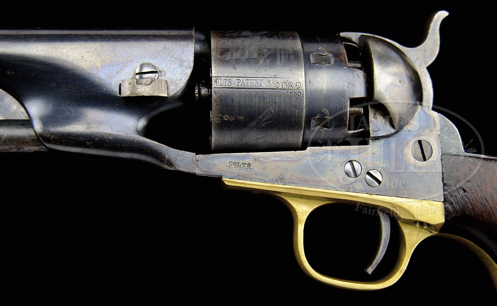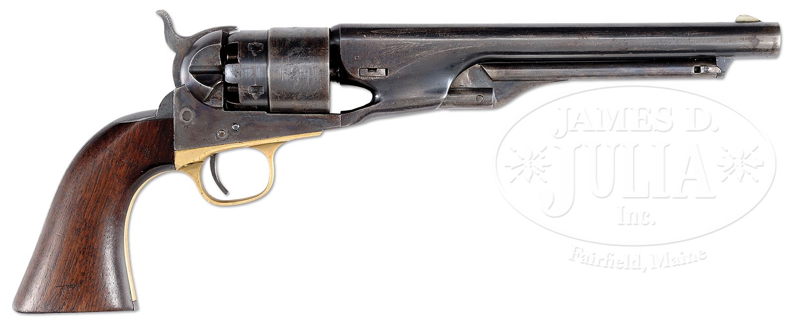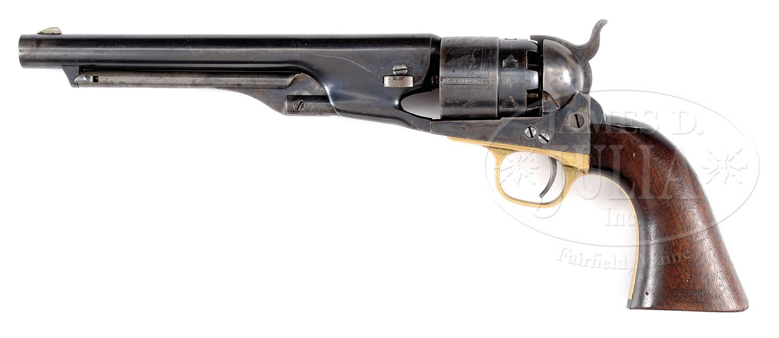EXTREMELY FINE CIVIL WAR MARTIALLY MARKED COLT MODEL 1860 ARMY PERCUSSION REVOLVER.SN 129,032. Cal. 44. This is an extremely fine example of a martial 1863 US cavalry purchased Colt Army revolver. Blue & color case hardened with 8″ rnd bbl, German silver front sight and 1-line U.S. America address. Frame has “COLTS PATENT” stamped on left side and is 3-screw style. Cyl is usual rebated style with 6-chambers and Ormsby Naval battle scene roll marking. All of the safety pins are crisp and serviceable. The brass trigger guard & iron backstrap contain a 1-pc walnut grip with last four digits of SN found in grip channel. Both sides of grip have crisp cartouches “JT” (John Taylor) and “JSD” (LT. John S. Dudley) several of the metal parts have inspector initials. According to Flayderman’s Guide to Antique American Firearms about 127,000 Model 1860 revolvers were purchased by the Federal Government for use in the Civil War. The vast majority of these revolvers were issued to front line troops and was the most extensively used handgun throughout the Civil War. This particular example is totally original and matching in every regard and has identical condition from muzzle to butt, you can not find a more honest Civil War example in such extremely fine condition. CONDITION: Extremely fine overall, all matching and original. Bbl retains about 90% orig blue with a few dings and dents around wedge slot and small areas of pin prick pitting near muzzle. “Feathering” in finish is easily discerned around sight and loading arm catch. Frame, hammer, and loading arm retain much of their bright case colors with balance muted and silver/gray. Cyl retains about 60 – 70% of its original blue finish and shows virtually all of its crisp and well discerned Ormsby Naval battle scene. Trigger guard exhibits a smooth yellow brass patina. Backstrap & buttstrap retain about 60 – 70% of their thinning original blue finish with the balance gray/plum. Grip is sound, solid, well fit with very good discernible inspector cartouches with edge wear as can be seen in photos. Mechanics are excellent and bore is crisp, shiny and well discerned. 49382-3 JS (20,000-30,000) – Lot 3146