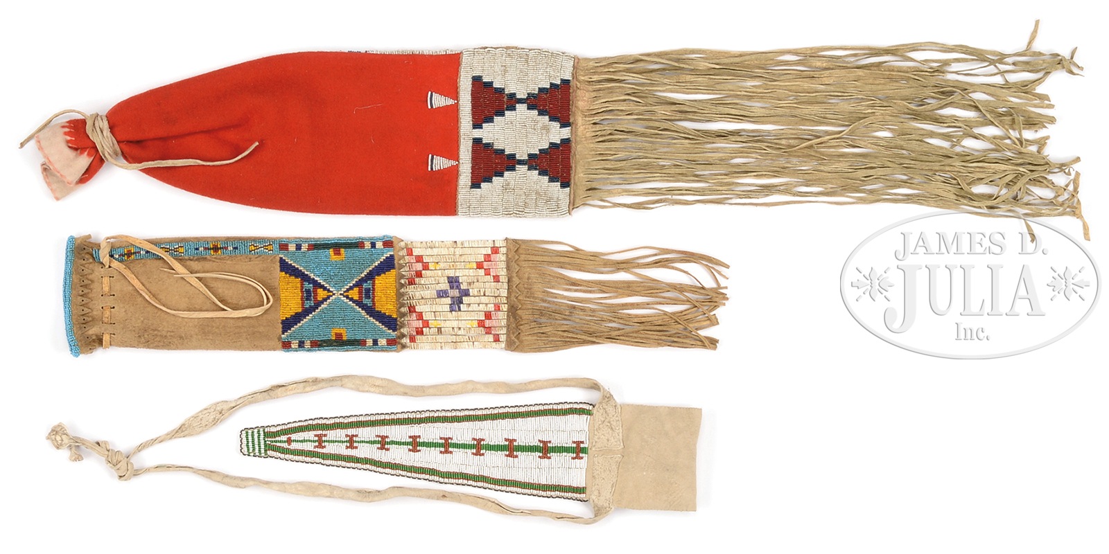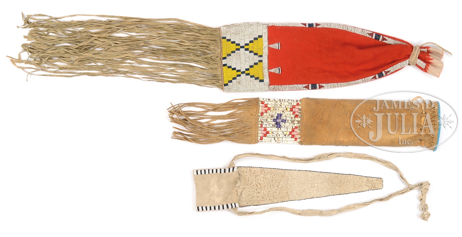 PLAINS STYLE WOMAN’S PIPE BAG WITH PLAINS STYLE BEADED BELT POUCH ALONG WITH CHEYENNE BEADED PIPE BAG.1) Woman’s pipe bag beaded on light blue background with hide cut-out design, quill wrapped fringe. 2) Cheyenne style pipe bag with typical geometric design beaded on hide and red trade cloth top, long hide fringe. Sinew sewn. 3) Plains style belt pouch, thread sewn on very soft deerskin hide, white background geometric design with long flap. SIZE: 1) 4-1/2″ w x 25″ l (with fringe). 2) 6-5/8″ w x 39″ l (with fringe). 3) 4-1/4″ w x 13″ l. CONDITION: 1) Good. 2) Good. 3) Very good. 50620-21 (800-1,200) – Lot 3146