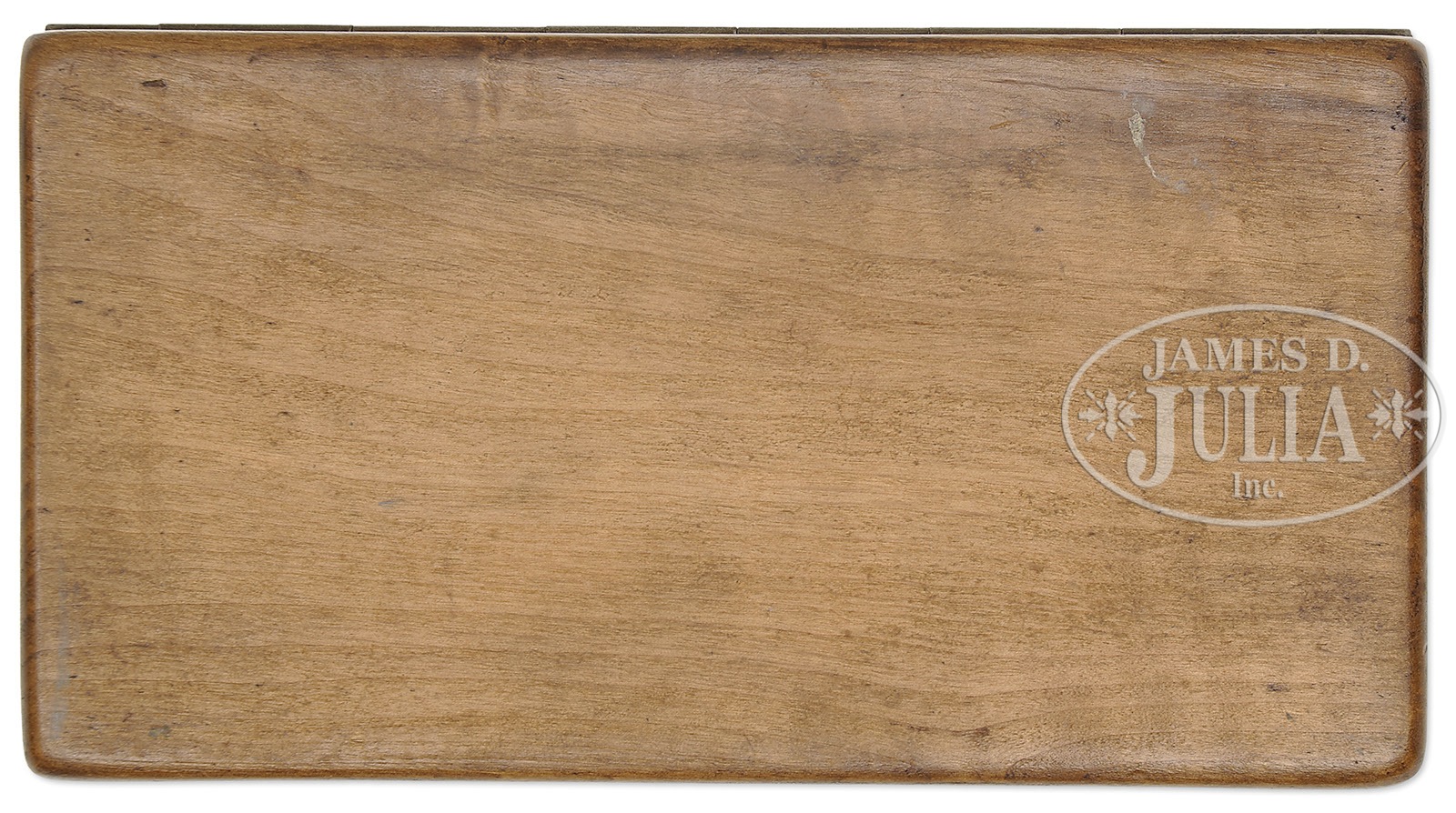 ERMA LUGER .22 CONVERSION UNIT, NAZI MARKED, SMALL WOOD CASE.SN 3607. Nazi marked Erma Luger .22 conversion unit contained in a small wooden case measuring 8-3/8″ x 4-1/2″ x 1-1/2″. The forward edge of the base is marked “ERMA” and Nazi eagle/77 accepted. The orig finish toggle assembly is numbered “3607” as is the aluminum magazine base. Bbl tube is in the white, measures 7-1/4″ long, is numbered “3370” and comes with a blued extension tube and a single knurled securing nut. The 5-shot blued magazine is eagle/77 acceptance marked on the lower spine. PROVENANCE: Collection of Dr. Geoffrey Sturgess, illustrated TBLAP. CONDITION: Toggle assembly has 95% orig salt blue with the extension tube retaining 85% orig blue. Mild oxidative dulling of the bbl insert that has a different SN. Mirror bore with sharp rifling. Case with scattered handling dings but no chips or losses. 4-52382 LMA130 (850-1,200) – Lot 3148
