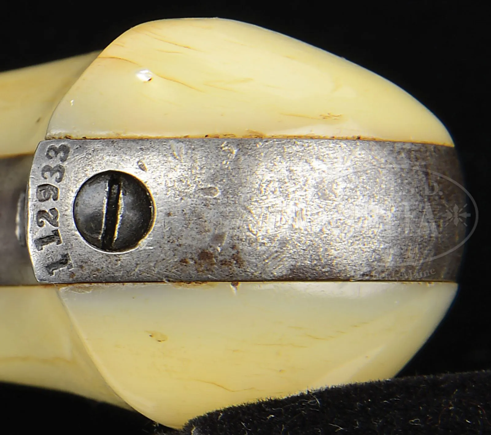 *RARE MODEL 1877 COLT 32 CALIBER “RAINMAKER”.SN 112933. 32 Cal. 4-1/2″ rnd bbl with 2-line address and roll engraved on left side “COLT DA 32”. Proper blade front sight has been slightly trimmed. Colt Lightnings made in 32 Cal. are quite rare with no more than 200 estimated in total production of almost 167,000 guns marketed originally as “Lightnings” in 38 Cal, “Thunderers” in 41 Cal and the rarely seen “Rainmaker” in 32 Cal. This gun appears orig and complete with matching SNs found on frame, trigger guard and backstrap. Bbl is stamped with a small “32” on bottom at base of bbl. Left side of frame is stamped with 3-lines of patent dates and rampant Colt motif in circle. Gun is fitted with 2-pc mother of pearl grips which fit gun nicely with no gaps. Based on SN this gun was made in 1899. PROVENANCE: Donn Heath, Ft. Worth, TX. Lewis Yearout 1974. Estate Collection of Lewis & Leyton Yearout. CONDITION: Gun overall is gray/brown with pitting overall and scattered scratches and blemishes as can be seen in photograph. There are traces of finish found in protected areas of backstrap, trigger guard, bbl and frame. Markings are all well defined and discernible. Front sight has been trimmed in height to about 2/10″ high as can be seen in photos. Mechanically functioning with crisp well discerned bore with pitting. 4-53937 JS71 (4,000-6,000) – Lot 3148