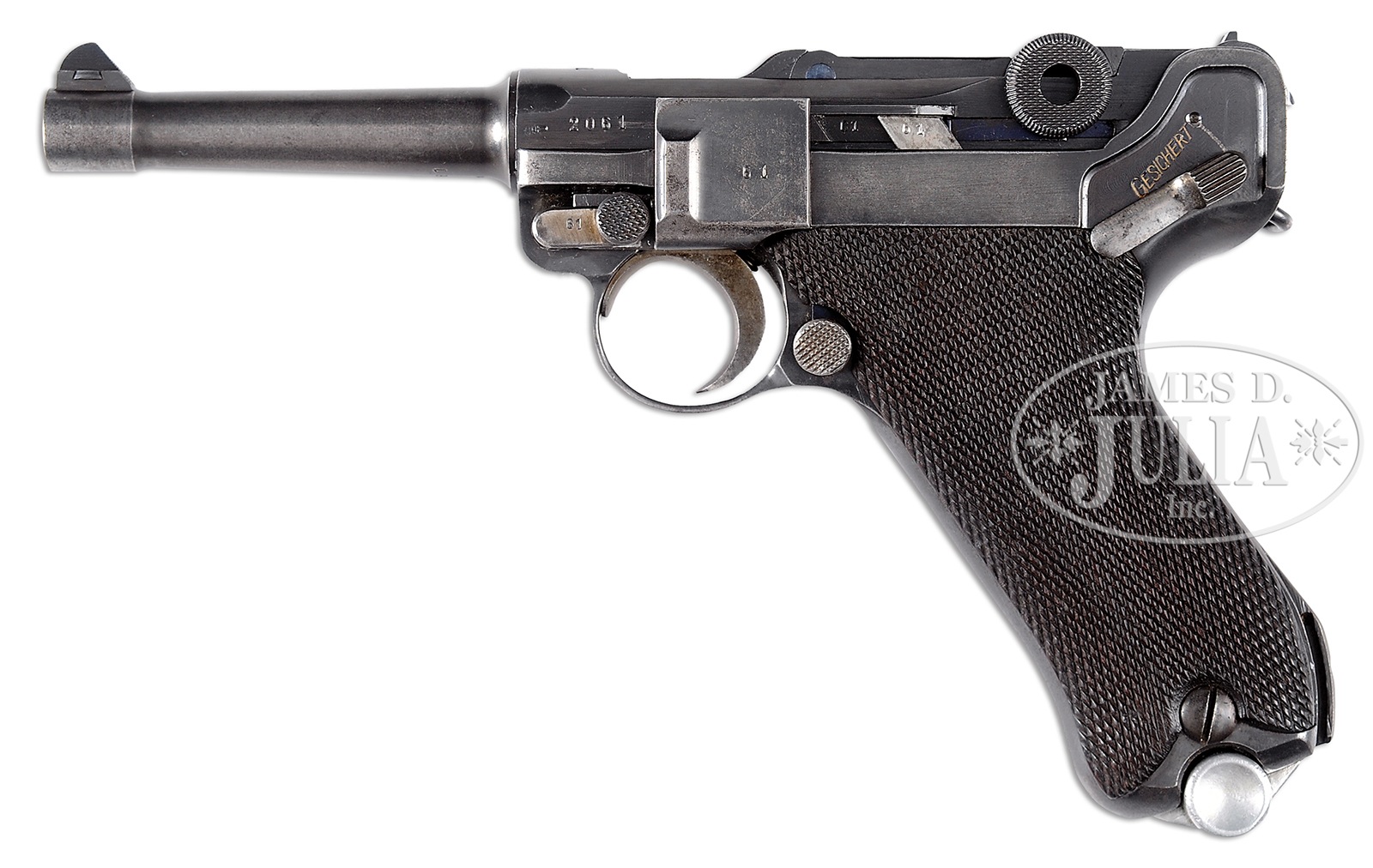 SN 2061. Cal. 9 mm. 4″ bbl with Eagle/63 proof and four digit SN on bottom. Crown/U proof on front of sight base. 1936 date above chamber. Early small 9 stave Mauser banner logo on center toggle link. Tiny Eagle/63 proof on back of frame. Crescent Moon with Star, “TC”, “Subaylara/mahsustur” (officer’s property) on right receiver, with tiny Eagle/63 proof in center. Crown/U proof on left receiver. Eagle/63 proof on stop lug. Numbers on gun are matching down to the firing pin. Eagle/63 proof on right frame next to takedown lever. Checkered walnut grips are unnumbered. Orig matching numbered mag has aluminum bottom and Eagle/63 proof. PROVENANCE: The Friedrich-Wilhelm Dauphin Collection, Germany. CONDITION: Fine, retaining 80% orig blue with most surfaces turning brown with corrosion and/or light pitting. 25% orig straw is visible. Grips are worn and oil soaked dark. Bore is bright and sharp. Mechanics are fine. Mag has normal wear and a few spots of pitting on body, aluminum bottom is excellent. 49828-42 (15,000-20,000) C&R – Lot 3148