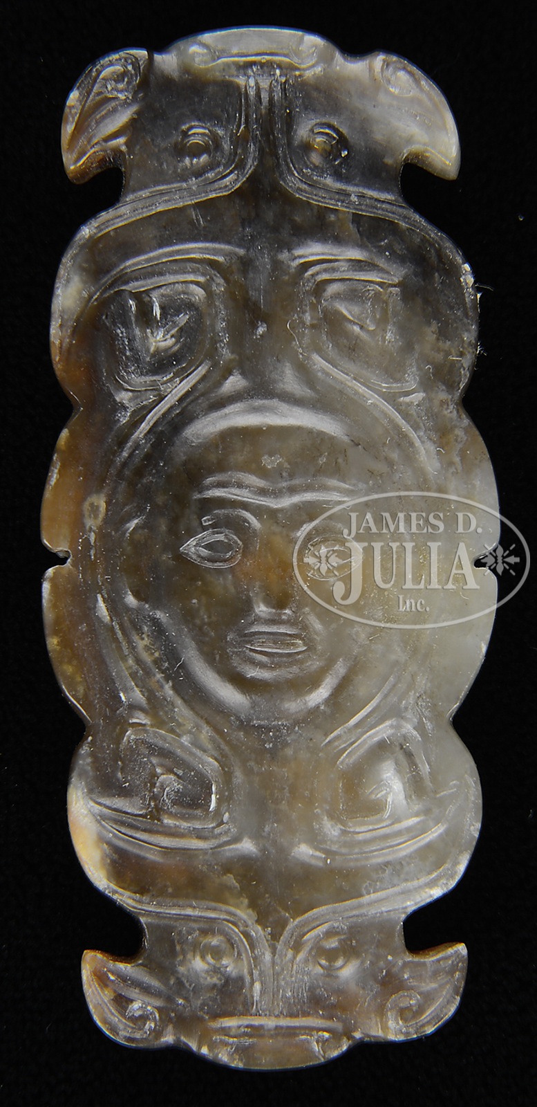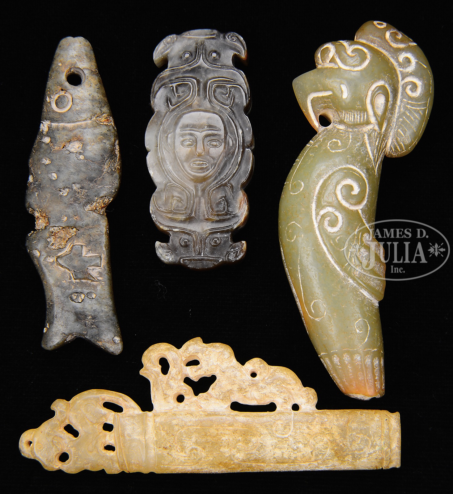 1) Depicting a fish in Neolithic style and probably of the period, China. Carved in the round with birds engraved on the surface. Gray-green stone heavily eroded and weathered. 2) Depicting a crested bird. Han style and possibly of the period, China. Carved with a single hole. Olive green stone with traces of ochre. 3) Oblong pendant. Warring states (4-2nd BC), China. With rounded ends carved as buffalo heads with a central human face. Single piercing through the middle. Brown stone with lighter gray markings. 4) Han style and possibly of the period, China. Bar shaped with a dragon projection and a phoenix finial. Yellow color with calcification. SIZE: 1) 2-1/2″. 2) 3″. 3) 1-7/8″ x 3/4″. 4) 2-3/4″ l. PROVENANCE: The personal collection of Dr. Helga Wall-Apelt. CONDITION: Very good with typical age wear. 47671-313, 95279, 95292, 95349, (600-900) – Lot 3149
