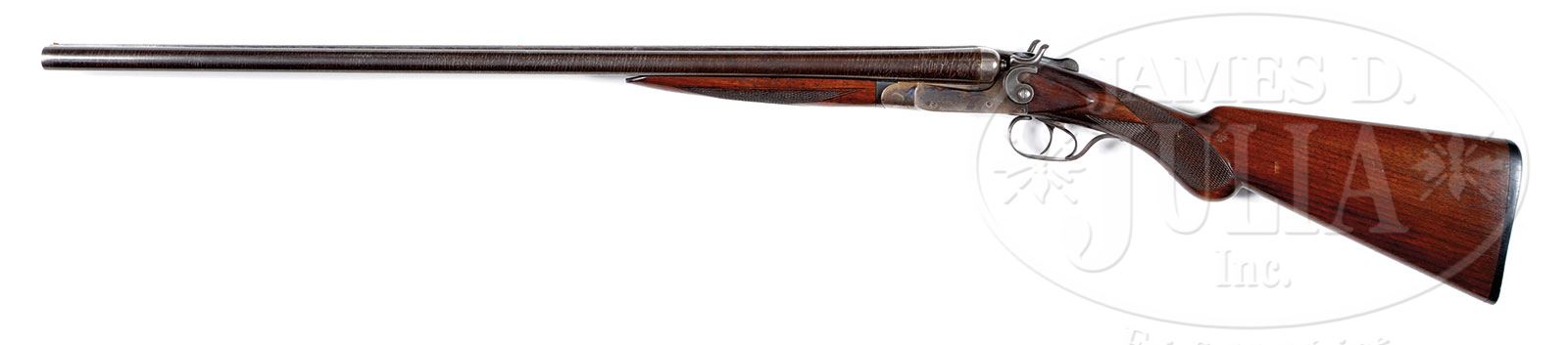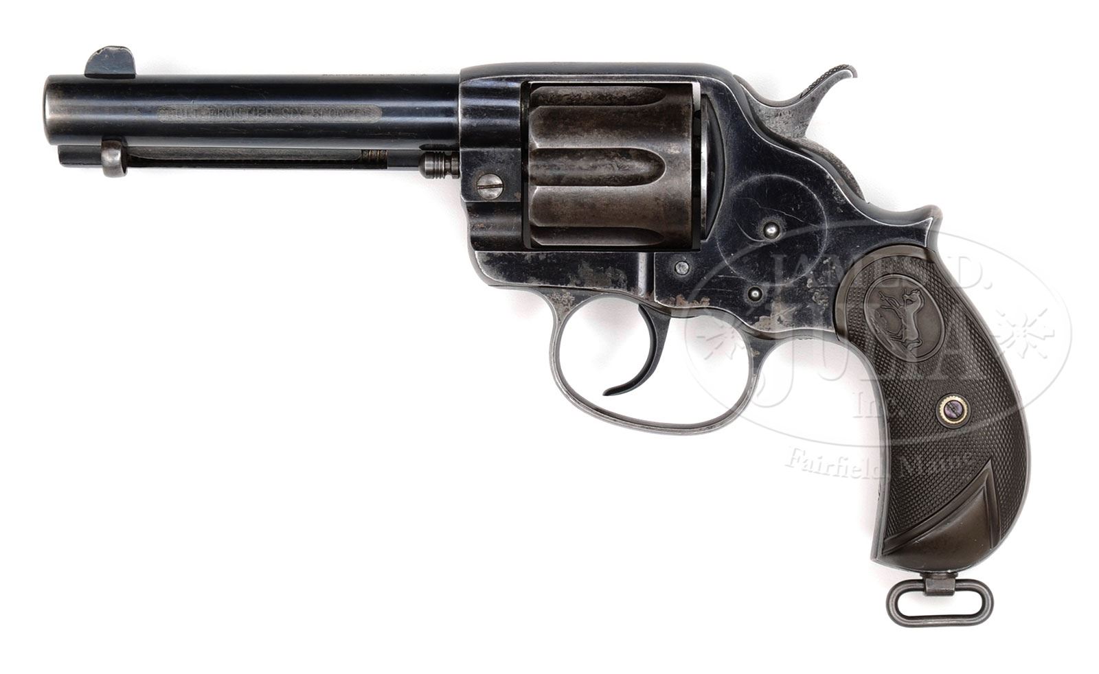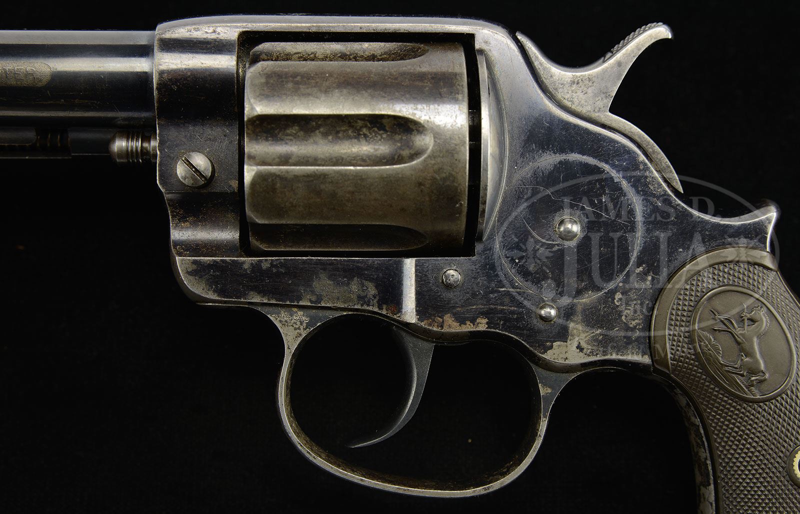 James D. Julia Auctioneers complies with all federal laws and regulations (Please review our Ivory Position Statement): As per the President’s Executive Order of February 2014, this item with its ivory is legal to sell and buy provided there is an ESA “Antique Certification” document proving the age. You must purchase an ESA in order to take possession of the ivory. If you wish to acquire the ivory after you purchase this gun, you must hire John Sexton, who is an independent consultant with the appropriate qualifications to prepare ESA certifications accepted by government agencies. John’s address is: 1962 Portage Landing North, North Palm Beach, FL 33408. ESA statements prepared by John Sexton can be acquired for a cost of $1,500.00/each. It is the buyer’s responsibility to make payment to John for the ESA statements. The documents are prepared by John and not by James D. Julia Auctioneers. Once the ESA statement is prepared and provided to Julia’s, you can have the ivory mounts. Be sure to keep a copy of your ESA certificate for your records also. THIS GUN IS BEING SOLD WITHOUT THE IVORY MOUNTS. YOU WILL NOT RECEIVE THE IVORY AT THE TIME OF YOUR PURCHASE. IF YOU WISH TO ACQUIRE THE IVORY ITEMS, YOU MUST PURCHASE AN ESA “ANTIQUE EXEMPTION” CERTIFICATE. NO EXCEPTIONS! *COLT MODEL 1878 FRONTIER SIX-SHOOTER DA REVOLVER AND ITHACA DOUBLE BARREL SHOTGUN THAT BELONGED TO DEPUTY SHERIFF T.J. CAHILL OF JOHNSON COUNTY, WYOMING WHO ASSISTED AT THE HANGING OF NOTORIOUS RANGE DETECTIVE TOM HORN.These two firearms belonged to Johnson County, Wyoming Deputy Sheriff Thomas Joseph “T. Joe” Cahill who was a family friend of infamous Indian scout, tracker and range detective Tom Horn. Cahill was born in 1877 in Wyoming Territory and died in 1965 in Cheyenne. On November 20, 1903 Tom Horn was hanged for shooting a 14 year old boy named Willie Nickell, a crime which to this day is still disputed in Wyoming and other circles. It was never proven that Horn actually killed the boy but his reputation was so fearsome that the jury found him guilty anyway. He was reputed to have killed 30 to 50 men in a short period time, all homesteaders who were accused of cattle rustling by the large ranchers. Horn was employed by the Cattlemen’s Association and, in particular, the Iron Mountain Ranch and John Coble. Horn had requested that his friends, Deputy Sheriffs Proctor and Cahill escort him to the gallows, which they did and Horn was hanged with a rope he had braided himself in his cell while waiting for the appeals process to be completed. Cahill went on to become the Executive Secretary of the Dude Rancher’s Association headed up by Larry Larom who owned Valley Ranch outside of Cody, WY and was the first dude rancher in the country. Cahill was also very active in the rodeo circles, including the Madison Square Garden Rodeo 1928-1933. He then became Chief of Police in Cheyenne, 1934-1940. As of this writing no additional information is available regarding T. Joe Cahill. At one time these firearms were part of a large display of Cahill’s badges and accouterments, including a letter on Iron Mountain Ranch Company letterhead, a pair of boots inlaid “T Joe” and a small piece of the rope with which Tom Horn was hanged. The location of those articles are currently unknown but may have been destroyed in the Yearout house fire. 1) SN 22083. Cal. 44 WCF (44-40). Blue finish with 4-3/4″ bbl, slightly reduced front sight and 2-line address with etched panel “COLT FRONTIER SIX SHOOTER” on the left side. Bottom of bbl has a tiny “44” and left front web of trigger guard is marked “44 CAL”. Butt of grip has a factory lanyard swivel. Mounted with 2-pc Rampant Colt hard rubber grips. Backstrap is engraved “T.J.C.”, the initials of Deputy Cahill. 2) SN 123611. Cal. 16 ga. A-grade Ithaca double bbl boxlock hammer shotgun with 28″ Damascus bbls & double ivory beads with extractors. Mounted with straight grain American walnut with checkered splinter forearm and Prince of Wales round knob stock with Ithaca Gun Co. monogrammed hard rubber buttplate. Top tang is engraved identically “T.J.C.” as the revolver. PROVENANCE: Estate Collection of Lewis & Leyton Yearout. CONDITION: 1) Very fine, all matching except grips which are unnumbered. Bbl & ejector housing retain about 92-93% strong orig blue with sharp, completely legible etched panel. Frame retains about 80% orig blue, showing edge wear and the rest of the losses from chemical staining. Backstrap is mostly a gray patina. Cyl is a blue gray patina. Grips are sound, showing light diamond point wear, turned chocolate on left side. Mechanics are fine. Bright shiny bore, shows very little actual use. 2) Very fine, all matching. Bbls retain 97-98% strong orig Damascus pattern with some slight thinning and light surface rust over the forearm area. Receiver retains about 60% strong case colors turned silver on the bottom and on the fences. Wood is sound with a couple small dings and retains most of its orig oil finish. Mechanics are fine. Bright shiny bores. 4-53939 JR273 (4,000-6,000) – Lot 3151 Click here to view provenance