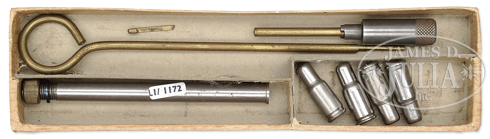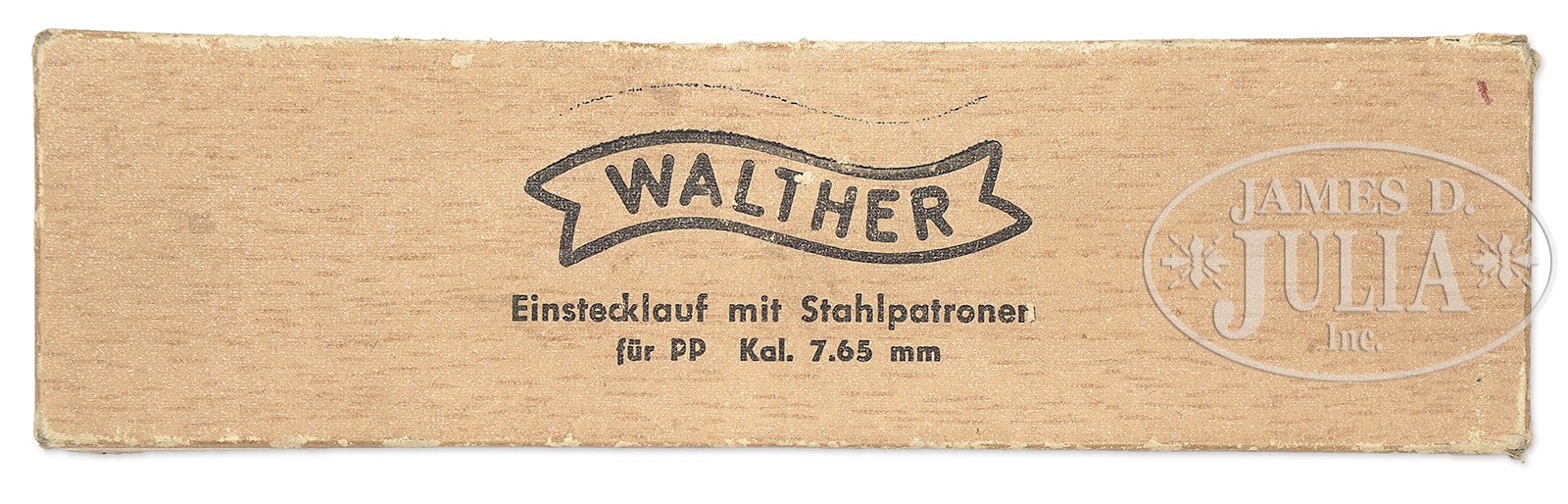 WALTHER PP 4MM CONVERSION KIT IN ORIGINAL BOX.SN NSN. Walther PP 4mm conversion kit in wood-simulated cardboard box whose lid is marked with the Walther banner overlying “Einstecklauf mit Stahlpatronen/fur PP Kal. 7.65mm”. The base is compartmentalized for the threaded insert tube with split ring washer and retaining nut, four cartridge inserts, a brass cleaning rod, and a case extractor. PROVENANCE: Collection of Dr. Geoffrey Sturgess. CONDITION: Orig box is in near excellent condition with no evidence of taping or gluing. In-the-white inserts are slightly dulled with minimal toning. The same toning applies to the mellowed brass extractor extension and cleaning rod. Mirror bore with sharp rifling. 4-52406 LMA132 (175-250) – Lot 3152