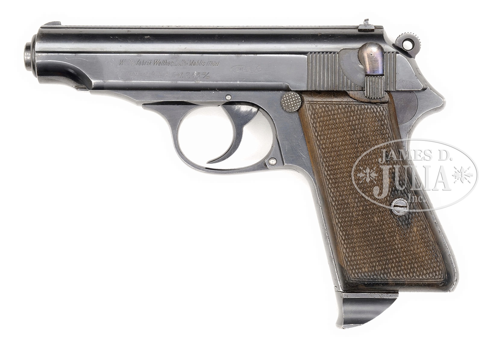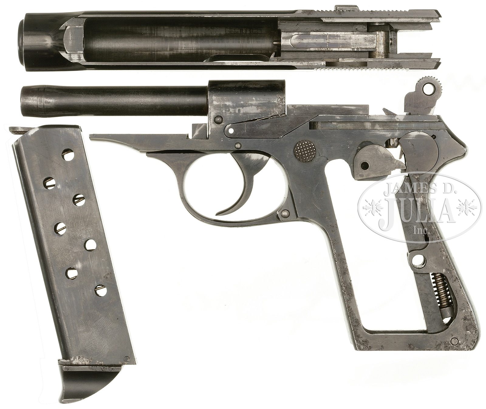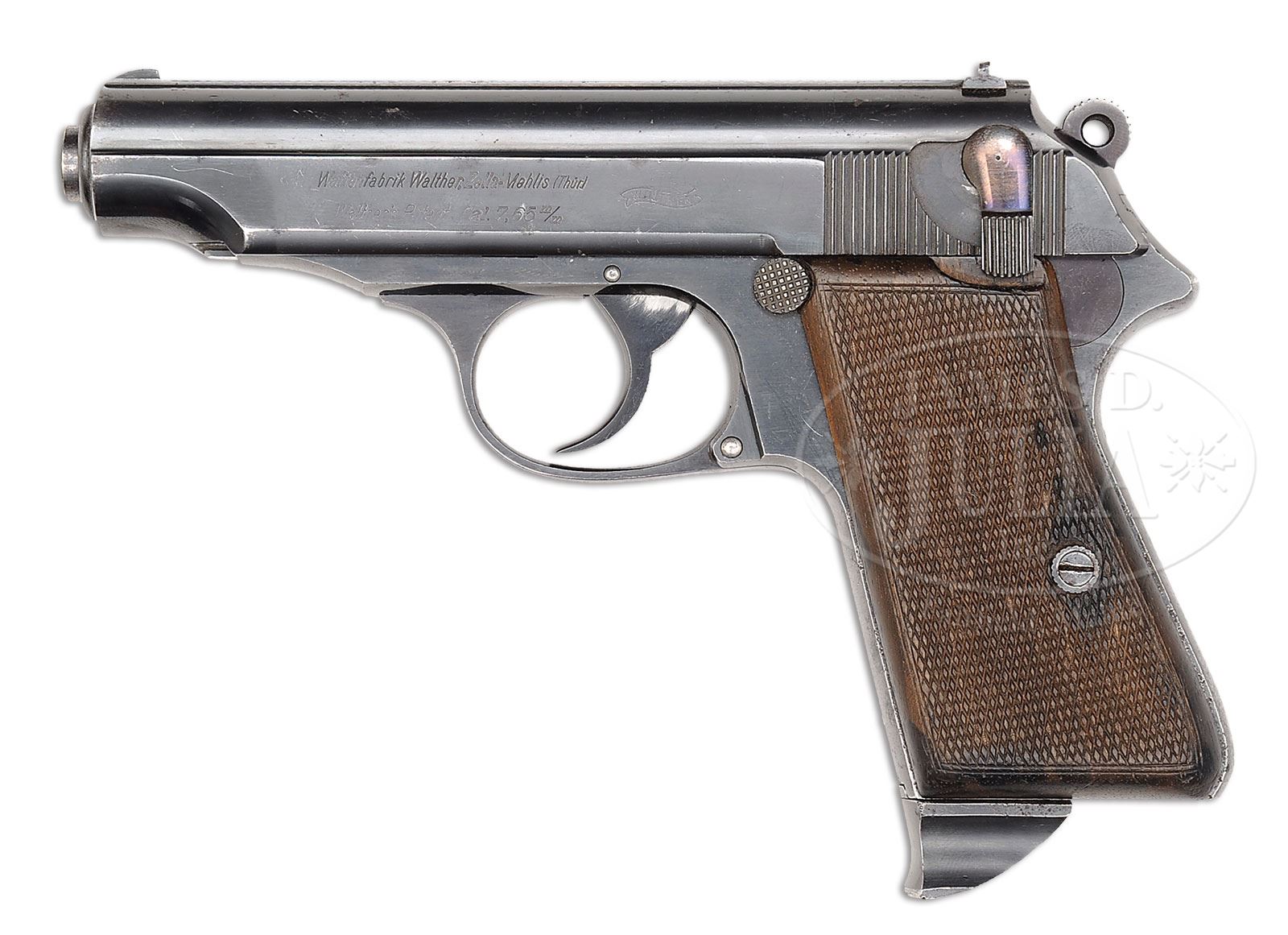 Please Note: The exploded interior images in the catalog for Lot #3153 are not for Lot #3153. Please see the images on our website for the correct exploded view. The full view of the complete gun and two close-ups in the printed catalog are of this gun. *◊ FABULOUS WALTHER PP PROTOTYPE SN 2.SN 2. 4″ 7.65mm (32 ACP) bbl. “Waffenfabrik Walther, Zella-Mehlis (Thur.) / Walther’s Patent Cal. 7.65m/m” and “WALTHER” banner on left side of slide. Front of slide is uniquely dovetail jointed to frame by “T” section frame extension, 90 degree safety lever. Prototype pattern checkered walnut grips with double lines within border. Prototype lock work. Unique magazine has prototype metal extension at base and no visible markings. Front grip strap is stamped with SN “2” towards bottom. Crown/N proofs on right side of bbl visible through ejection point, directly below on slide and on frame. One of a kind PP that is a study in the development from the Model 4. PROVENANCE: Collection of Dr. Geoffrey Sturgess. CONDITION: Excellent. Retaining 97% orig bright blue with sharp edge wear and light fading & corrosion on grip straps. Bore is bright and sharp. Grips are excellent with minor dings and dents to checkering. Magazine retains 95% orig blue. Mechanics are excellent. 4-52591 BWS132 (15,000-20,000) – Lot 3153