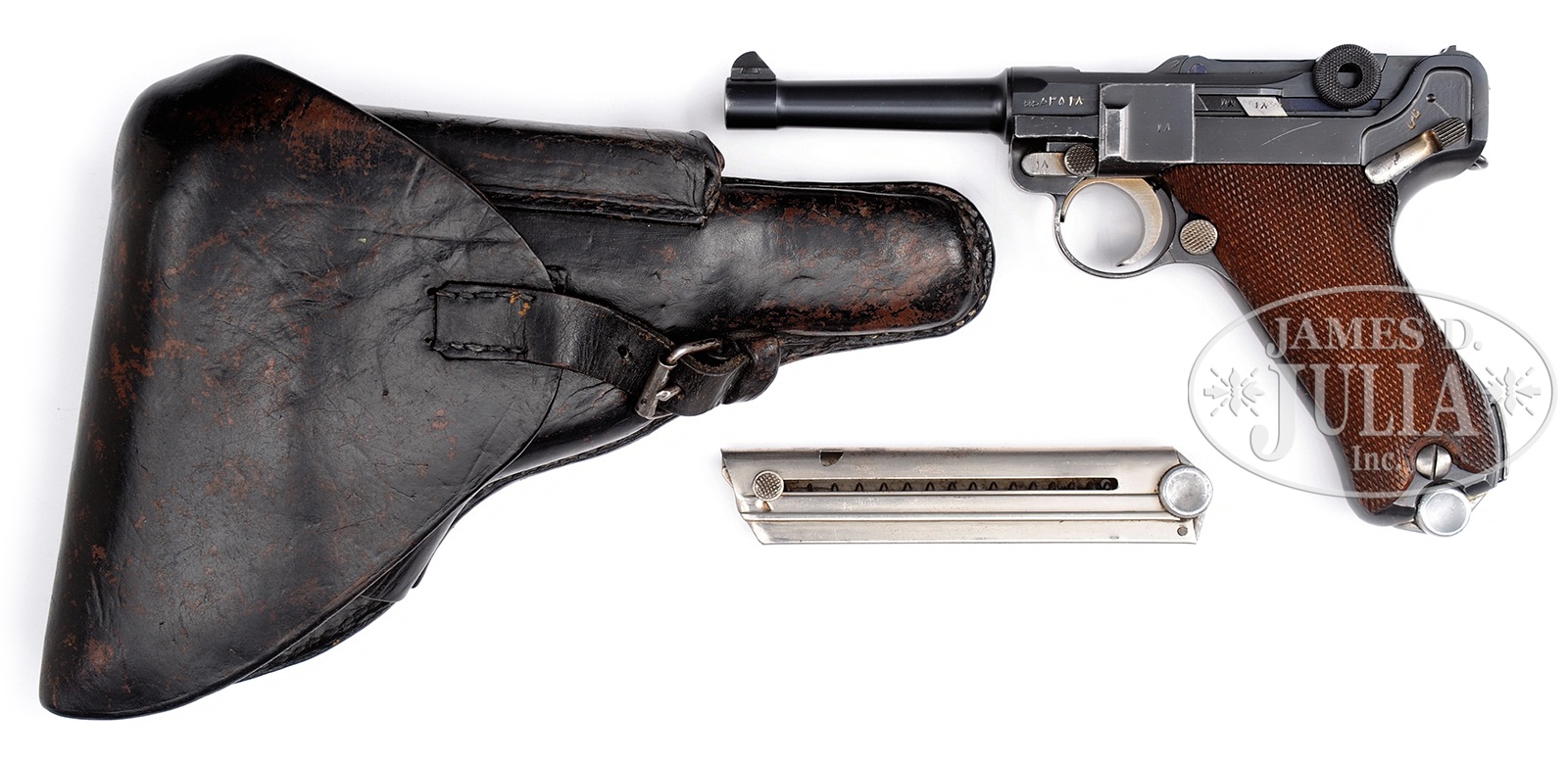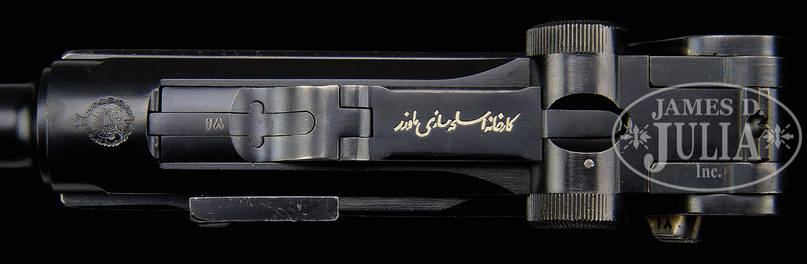 *RARE PERSIAN MAUSER 4″ LUGER RIG.SN 3518. Cal. 9mm. SN “1903” with Crown U proof on left side of receiver. Full SN on front of receiver in Farsi and left side of chamber. Pahlavi crowned lion crest above chamber. Farsi script on center toggle link “Parabellum Short Model 1314”, (in Farsi 1314 being a Gregorian year 1935), next to a Persian proof on right side of receiver. Left side of receiver has a horizontal Crown U proof next to a full SN in Farsi. Upper safe position and extractor are marked “Safe and Loaded” in Farsi. All numbered parts on gun are matching in Farsi. Checkered walnut grips, proper Persian aluminum bottom magazine with matching numbers in Farsi. Accompanying this gun is the Persian pattern holster and spare magazine both numbered and matching in Farsi. CONDITION: Very fine, with typical light holster wear at muzzle, high points of trigger plate, and front edges of frame. Several very small scratches on backstrap above stock lug. Grips are excellent with light wear at bases and more than half of the period straw finish remains on trigger, levers and magazine release. An exceptional Persian rig. 51033-68 TDW (4,000-8,000) C&R – Lot 3153