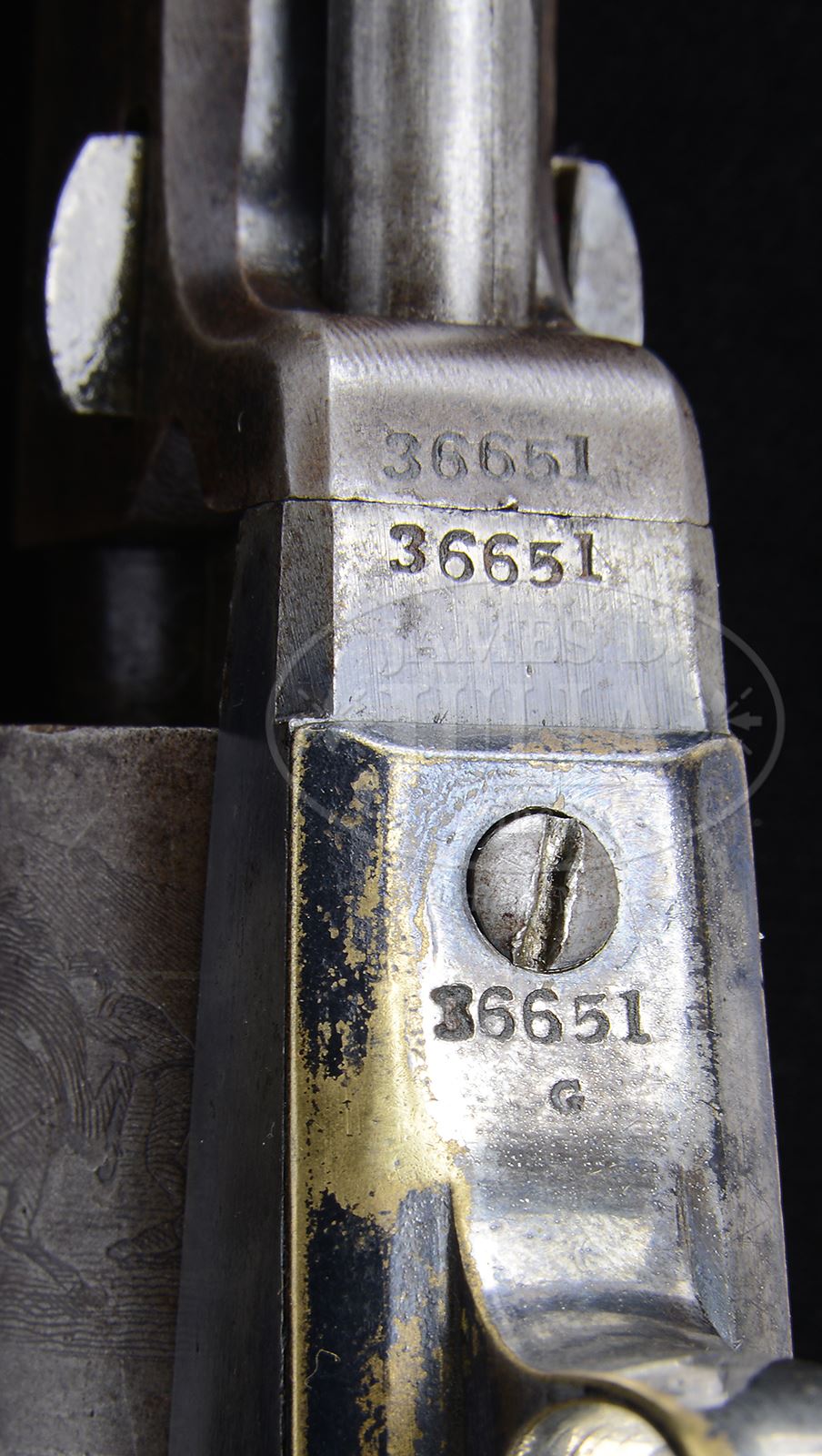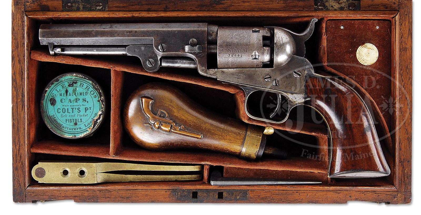 VERY EARLY AND SPECIAL CASED SAMUEL COLT PRESENTATION MODEL 1849 POCKET PERCUSSION REVOLVER PRESENTED TO THE ORGANIZER OF THE WORLD FAMOUS CRYSTAL PALACE EXHIBITION IN LONDON.SN 36651. Cal. 31. Blue and color case hardened with 5″ oct bbl, brass pin front sight and two line “New York City” address with brackets. Left side the frame has tiny “COLTS PATENT” and the small guard silver plated brass trigger guard and backstrap contain a one piece walnut grip with last four digits of matching serial number in the back strap channel. Back strap is engraved in old English and period script “Presented To Mr. G. Whiting / by Col. Saml Colt 1851”. Mr. Whiting was the organizer of the world renowned Crystal Palace Exhibition. Accompanied by a rare, special made brown velvet lined English oak casing with brass medallion in lid and swinging English latches on the front, with a mortised brass lock and round escutcheon in the front. Bottom is compartmented for the revolver with a recess for the cylinder, a single sided revolver flask, a two cavity brass Colt’s Patent mold without sprue cutter, an L-shaped nipple wrench and an early lacquered tin of Ely’s caps. Covered right rear compartment contains cast lead bullets and balls. This exact cased set is pictured in color as Fig. 3 on pg. 252 of COLT’S POCKET ’49, Jordan & Watt. Back strap of this revolver is pictured as Fig. 2 on pg. 231 of the referenced publication. This casing is a special made for presentation at the London Exhibit at the Crystal Palace and is one of the first known uses of the “Col. Saml Colt” wording on a firearm presentation, possibly even before he used the title in the US. CONDITION: Revolver is very good, all matching including wedge and grip. Bbl retains 60-70% thin, orig blue turning plum over the top. Rammer retains smoky case colors, stronger on the left side of the pivot. Frame retains smoky, thin, faded case colors with unusual polishing marks. Trigger guard and back strap retain strong orig silver plating with the exposed areas a medium mustard patina. Cylinder is a gray-brown patina and retains about 75-80% stagecoach holdup scene. Grip is sound showing moderate edge wear with light nicks and scratches and retains about 85% orig varnish. Mechanics are fine. Strong bright bore with scattered pitting. Case is sound with usual handling and storage nicks & scratches and retains most of its orig varnish. Interior is moderately to heavily faded with moderate to heavy soil in the bottom, partitions are sound. Flask is fine and retains about 50-60% orig finish. Mold is crisp and appears unused with a few minor nicks and scratches. Cap tin is good. 49564-6 JR (20,000-30,000) – Lot 3154