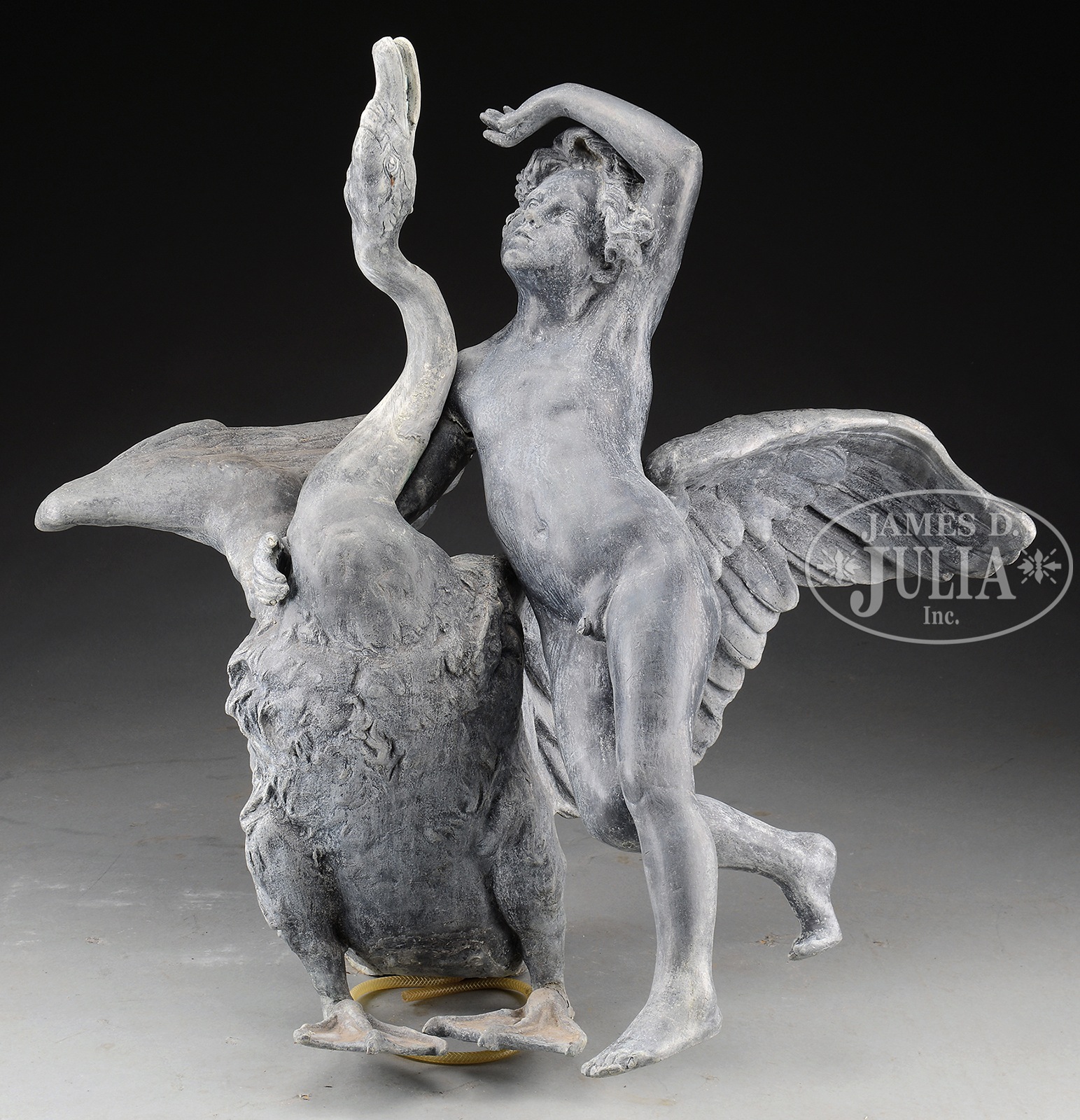 CAST LEAD FOUNTAIN OF FIGURAL GROUP WITH SWAN AND YOUTH.3rd quarter 19th century, American, possibly New York. Fountain in two parts, depicting young boy standing to left of swan figure, left arm extended toward upraised beak, right arm around lower neck of swan with outstretched neck, beak pointing skyward and open tubular end of fountain embedded within swan’s mouth. Figure’s wings are outstretched and posed balancing on its tail and webbed feet. Fountain now with natural grey patina with some verdigris. SIZE: App size: 46″h overall. 47″ w overall. 40″ d overall. PROVENANCE: From a private Massachusetts collection. CONDITION: Surface as noted. Youth with some open seam issues beneath right arm. Figural group will need some minor restoration and adjustments for reassembly. Otherwise good. 50800-4 (2,000-4,000) – Lot 3156