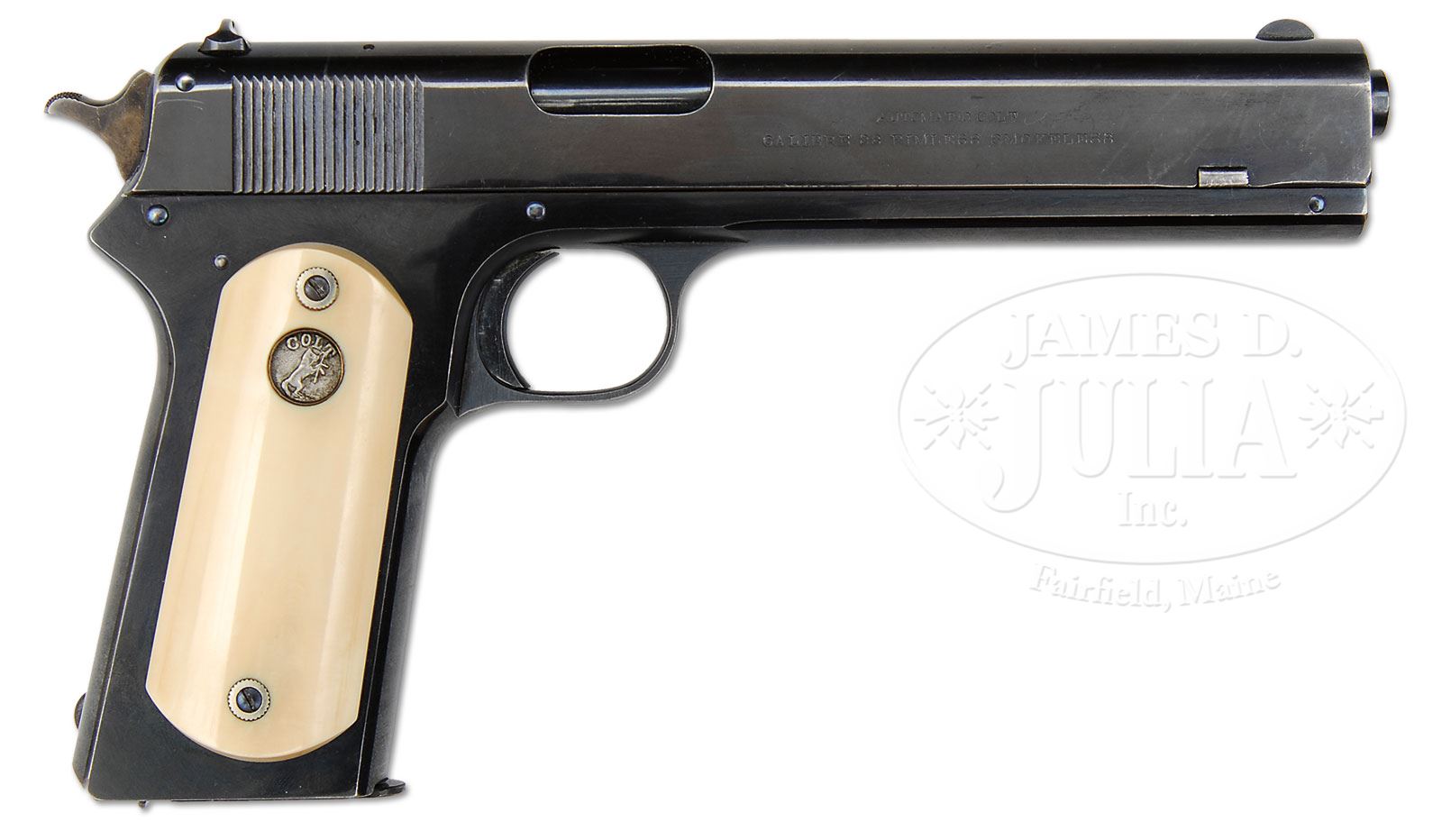 James D. Julia Auctioneers complies with all federal laws and regulations (Please review our Ivory Position Statement): The ivory on this item is one hundred years old or more and is accompanied by an ESA attesting to this. When you purchase this firearm inclusive of ivory, we will receive the ESA statement. As per the President’s Executive Order of 2014, provided the ivory is over one hundred years old and can be proven by an ESA certification, it is legal to sell, buy, and export. YOU ARE BUYING THIS GUN COMPLETE WITH ITS IVORY WHICH IS ONE HUNDRED YEARS OLD AND AN ESA “ANTIQUE CERTIFICATION” WILL ACCOMPANY THIS. *FINE COLT MODEL 1902 MILITARY SEMI-AUTO PISTOL.SN 35560. Cal. 38 ACP. Blue finish with 6″ bbl, fixed sights with slide stop on left side and a lanyard swivel in left heel. Mounted with 2-pc smooth factory ivory grips with deep left & right Colt medallions. This is a standard production model with rear slide serrations and spur type hammer. According to Flayderman’s Guide to Antique American Firearms there were approx. 18,000 of these fine pistols produced in the period 1902-1929. However, they remained in service well into the 1950s with target shooters due to their reliability and inherent accuracy. They were ultimately supplanted by the advent of accurized 1911s and other newer model pistol. Accompanied by one orig, unmarked, all blue magazine. PROVENANCE: Jerry Fountain; Robert Howard Estate Collection. CONDITION: Very fine. Slide retains 93-95% glossy orig charcoal blue with front edge and sharp edge wear and some light thinning on left side; frame retains 96-98% glossy orig charcoal blue with only faint sharp edge wear; hammer retains about all of its orig bright case colors; grips are sound with one small age line and retain a wonderful mellow ivory patina. Mechanics are crisp, brilliant shiny bore. May have been fired but if so very little. 4-51975 (5,000-8,000) – Lot 3158