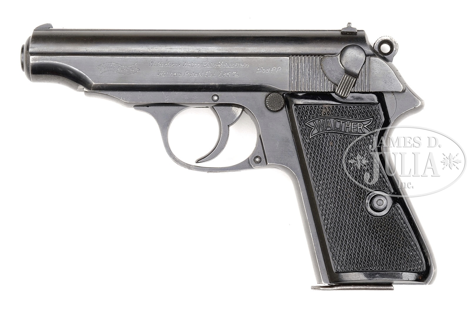*◊ RARE WALTHER PP WITHOUT FACTORY NUMBERS.SN 4A. 4″ 7.65mm (32 ACP) bbl. “WALTHER” banner, “Waffenfabrik Walther, Zella-Mehlis (Thur.) / Walther’s Patent Cal. 7.65m/m”, “Mod. PP”. Eagle/N is visible on the bbl through the ejector port and another directly below on slide. Importer added “4A” SN on right side of frame behind trigger. No other externally visible markings. Checkered black plastic Walther Banner grips with border. Magazine has Walther Banner above “PP 7,65m/m” on body. PROVENANCE: Collection of Dr. Geoffrey Sturgess. CONDITION: Excellent. 95% orig blue with some touch up to slide. Bore is bright and sharp. Grips are sharp with very little wear. Magazine retains 90% blue with scattered light corrosion. Mechanics are excellent. 4-52605 BWS130 (2,000-3,000) – Lot 3159