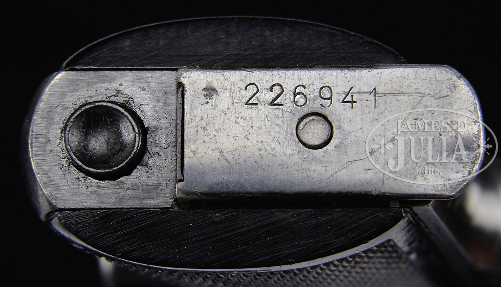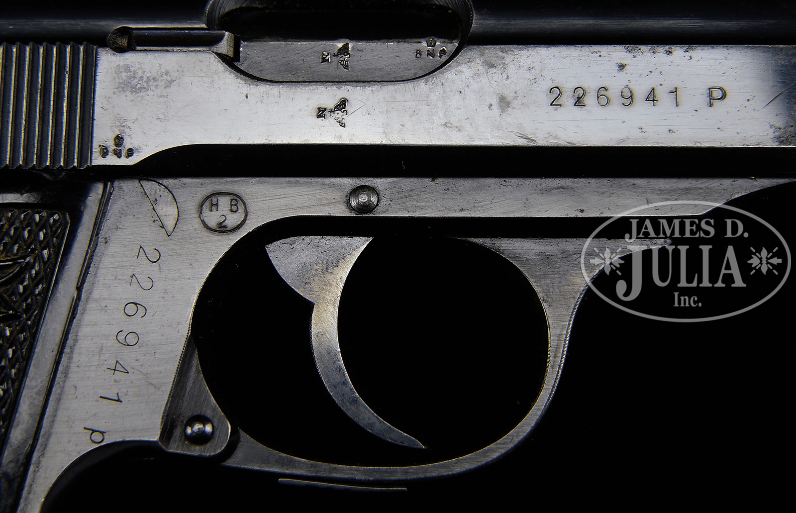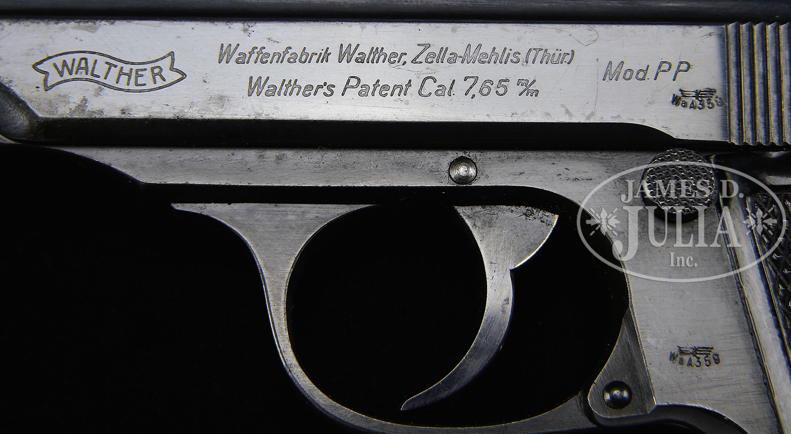 *◊ WALTHER PP HIGH POLISH ARMY ISSUE WITH MATCHING MAGAZINE.SN 226941P. 4″ 7.65mm (32 ACP) bbl. “WALTHER” banner, “Waffenfabrik Walther, Zella-Mehlis (Thur.) / Walther’s Patent Cal. 7.65m/m”, “Mod. PP” followed by Eagle/WaA359 on left side of slide. British proofs. Eagle/N is visible on the bbl through the ejector port and another directly below on slide followed by full SN. SN on right side of frame behind trigger. Left frame has Eagle/WaA359 behind trigger. Checkered black plastic Walther Banner grips with border. Matching magazine has Walther Banner above “PP 7,65m/m” on body. PROVENANCE: Collection of Dr. Geoffrey Sturgess. CONDITION: Excellent. Retaining 97% orig high polish blue with some very light corrosion on slide. Bore is bright and sharp. Grips are excellent with few dings to checkering and border. Magazine retains 95% orig blue. Mechanics are excellent. 4-52610 BWS129 (2,000-3,250) – Lot 3160