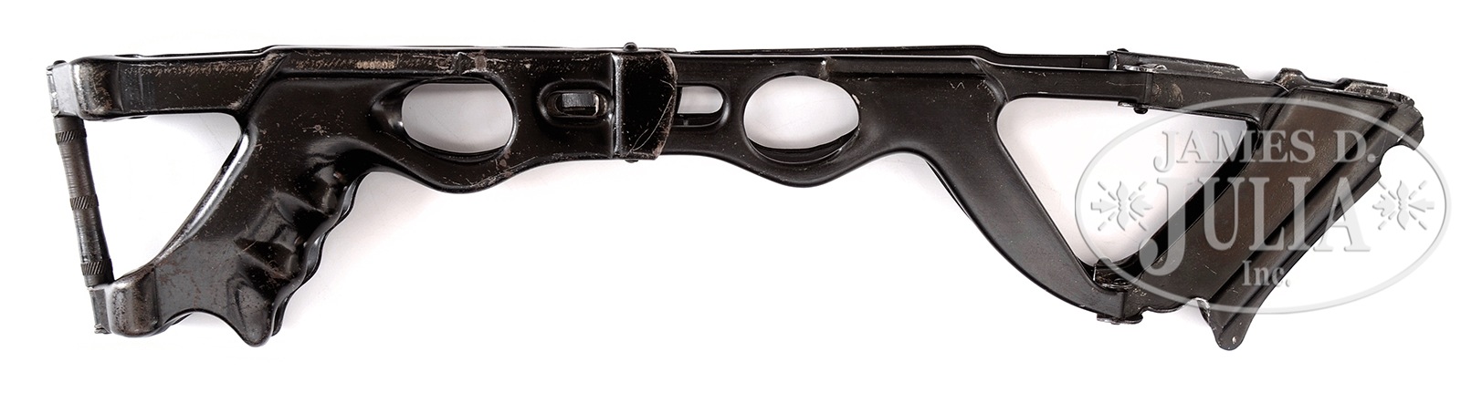 VERY RARE BENKE THIEMANN SHOULDER STOCK FOR LUGER.SN NSN. Pressed metal, folding stock marked “PATENT BENKE/THIEMANN D.R.P.u.A.P.” on left side. Right side has SN 000206. Designed to replace the orig grips on a Luger and fold out into a shoulder stock. Only a few hundred were made, and very few are known to exist. PROVENANCE: The Friedrich-Wilhelm Dauphin Collection, Germany. CONDITION: Very fine, retaining 90% orig black finish with normal wear on edges and corners, and a few areas of corrosion and light pitting. Mechanics are fine. 49828-199 BWS (10,000-14,000) – Lot 3160
