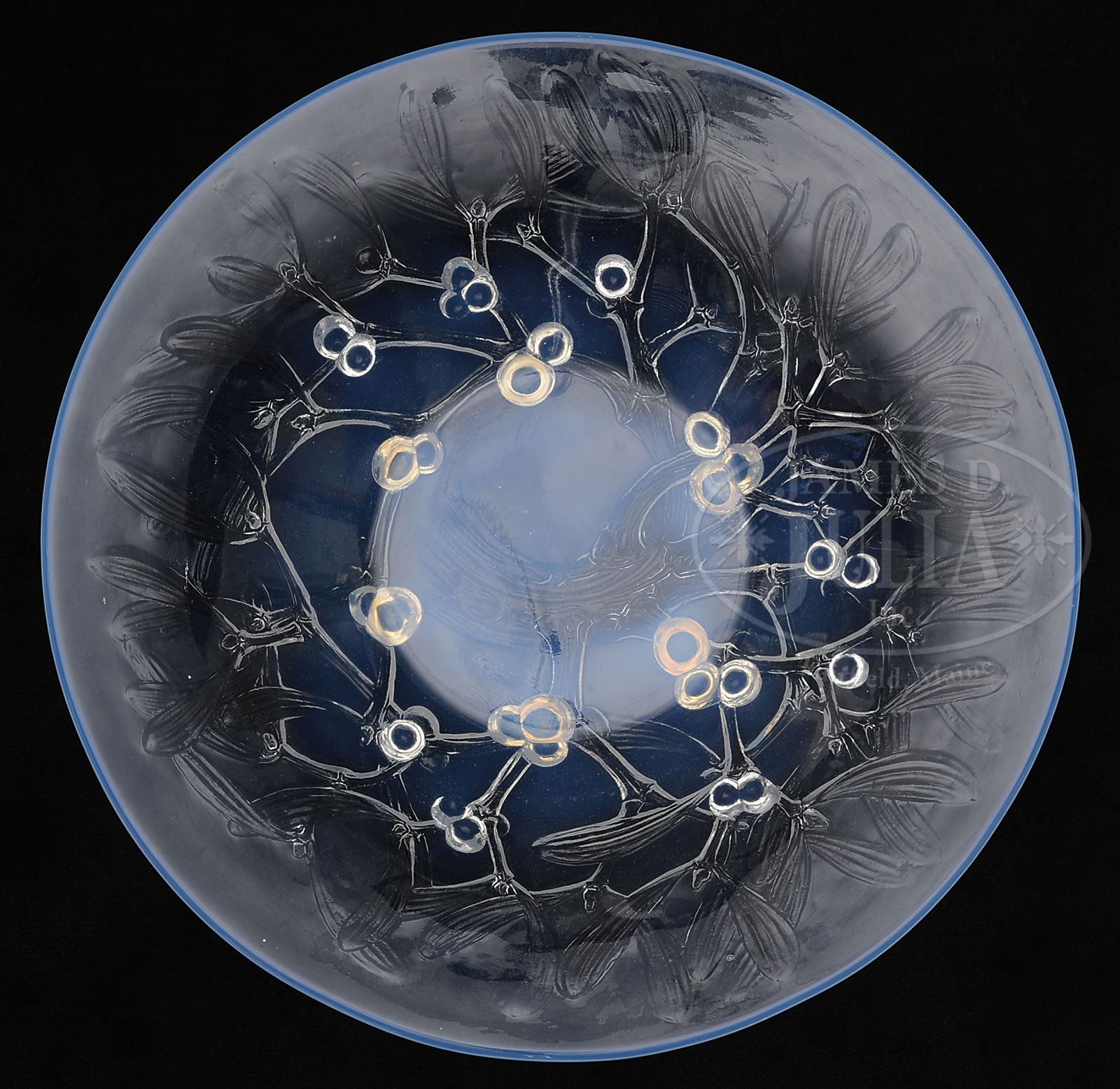 R. LALIQUE MISTLETOE BOWL.R. Lalique bowl has pressed pattern of mistletoe surrounding the bowl and extending across the bottom. The rim, bottom of bowl and mistletoe berries are done in opalescent glass. Signed on underside in acid etched block letters “R. LALIQUE FRANCE”. SIZE: 11-3/4″ dia. PROVENANCE: Tom Dimitroff Collection. CONDITION: One tiny flea bite to the underside of the rim, otherwise very good to excellent. 5-69454 (400-600) – Lot 3163