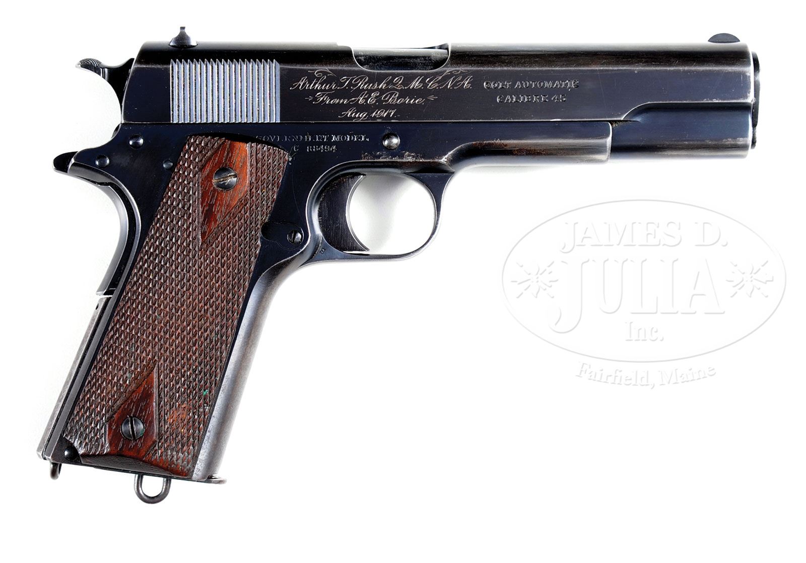 *PRESENTATION COLT GOVERNMENT MODEL SEMI-AUTO PISTOL FROM SAVAGE ARMS PRESIDENT A.C.BORIE IN 1917.SN C88494. Cal. 45 ACP. Blue finish with 5″ military bbl and orig fixed sights. Lower left side of bbl is marked “COLT 45 AUTO” & has a small “P” proof on left side of lug with a “G” proof on bottom of bbl. Slide and frame have usual markings. Pistol is mounted with diamond checkered walnut grips and accompanied by one 2-tone, lanyard loop, orig military magazine. Also accompanied by a private purchase brown leather swivel holster. Holster has a short drop with brass flap closure stud and is missing the leg strap. Right side of slide is engraved in very fine script “Arthur T. Rush Q.M.C.N.A. / From A.E. Borie / Aug. 1917.” This is a rather important presentation by a man directly involved in the role of the Lewis machine gun to the U.S. Military. Mr. Borie was at that time, and in the preceding years the head of Savage Arms Corp. and for several years had been working on developing the Lewis machine gun to accommodate U.S. Military ammunition. Finally after substantial testing and intense demand of the military for machine guns at the beginning of WWI, Savage was awarded large contracts to manufacture these guns. Mr. Rush was a member of the U.S. Army Quartermasters Corps but we have yet to learn his involvement, if any, with the Lewis gun contracts. However, Rush was Mr. Borie’s son-in-law. Consignor is a direct descendent of Mr. Rush with middle name of “Borie”. Colt records indicate 1917 shipment to Schoverling, Daly & Gales in NYC. Accompanied by a late period 1860 pattern Staff & Field Officer’s sword and scabbard bearing the initials “A.T.R” and marked with the Francis Bannerman, New York logo, which consignor states as belonging to Capt. Arthur Temple Rush. CONDITION: Very fine. Slide retains about 90% strong orig blue with muzzle end and sharp edge wear. Frame retains 90-92% strong orig blue with holster wear on bottom front and sharp edge wear. Front strap is lightly freckled over strong blue. Spring housing is a plummy/brown patina with light surface rust. Grips are sound showing light diamond point wear with wear on bottom right edge. Mechanics are fine. Bright shiny bore, shows very little use. Magazine retains about 97-98% orig finish. Holster is flexed on flap and toe showing moderate wear and soil with a compression bulge near top front and overall retains about 75% orig brown finish. Sword and scabbard are fine. 4-53683 JR279 (5,000-10,000) – Lot 3163