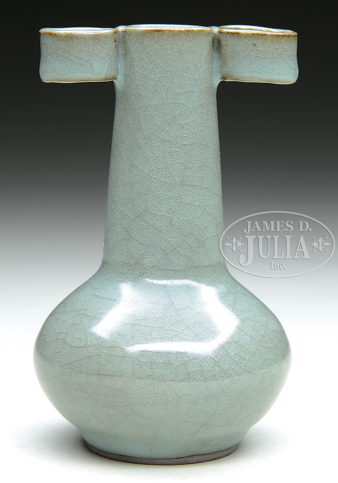 GUAN-TYPE LONGCHUAN ARROW HEAD VASE.The compressed globular body rising to a tall cylindrical neck with a pair tube handles around the mouth rim, covered overall with a lustrous gray-green glaze suffused with dense crackles. SIZE: 5″ h. PROVENANCE: From a Northern California Family through descent from Dr. B. Engstrom of Stockholm, Sweden (bears label on bottom). CONDITION: Very good. 49935-15 (3,000-5,000) – Lot 3163