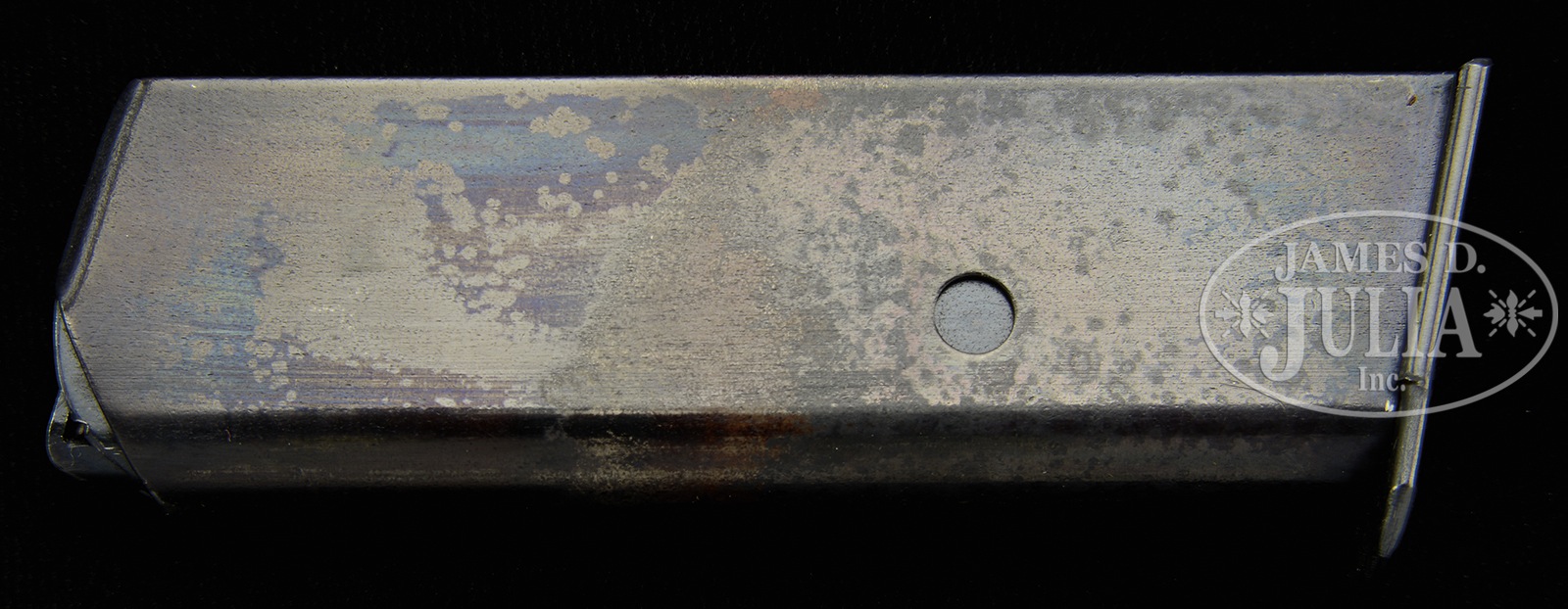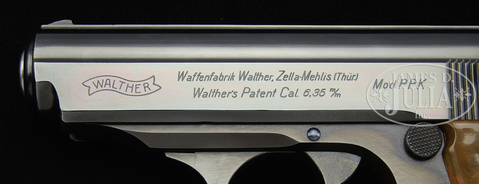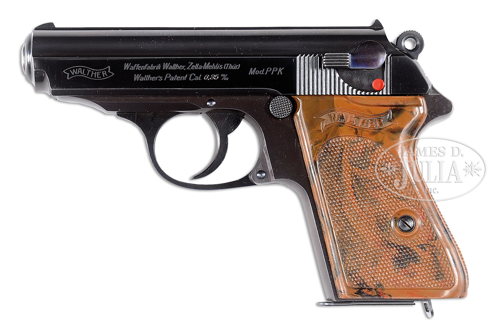 SN 778499. Cal. 6.35 mm. Stunning, near new, Walther PPK with high polish salt blue in the super rare 6.35 caliber. Standard configuration PPK with 3.25″ bbl having fixed front and rear sights separated by matted rib. Left side of slide with 90 degree safety marked with Walther banner followed by 2-line inscription that includes “Cal. 6.35 m/m” suffixed by “Mod. PPK”. Crown N proofing on right side of bbl hood and right side of slide. Full SN on right frame, vertically oriented behind trigger. Single piece mottled brown wrap-around grip secured with a single transverse screw. Slide disassembly shows a matching hand inscribed “499”. Correct unmarked magazine with 7 indicator holes on right side and internal sleeve for the smaller 6.35 mm cartridge. CONDITION: Better than 99% bright orig salt blue with only the most minute sharp edge wear at the muzzle and a tiny fleck of wear at the top of the frontstrap. Comparable condition grip that shows no cracks under the rear tang or around the grip screw escutcheons. Mirror bore. Perfect manual mechanics. It would be virtually impossible to improve upon this all original, super condition pistol! 51069-1 LMA (19,000-25,000) – Lot 3163