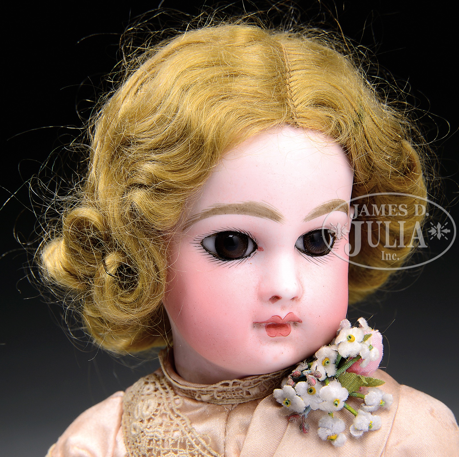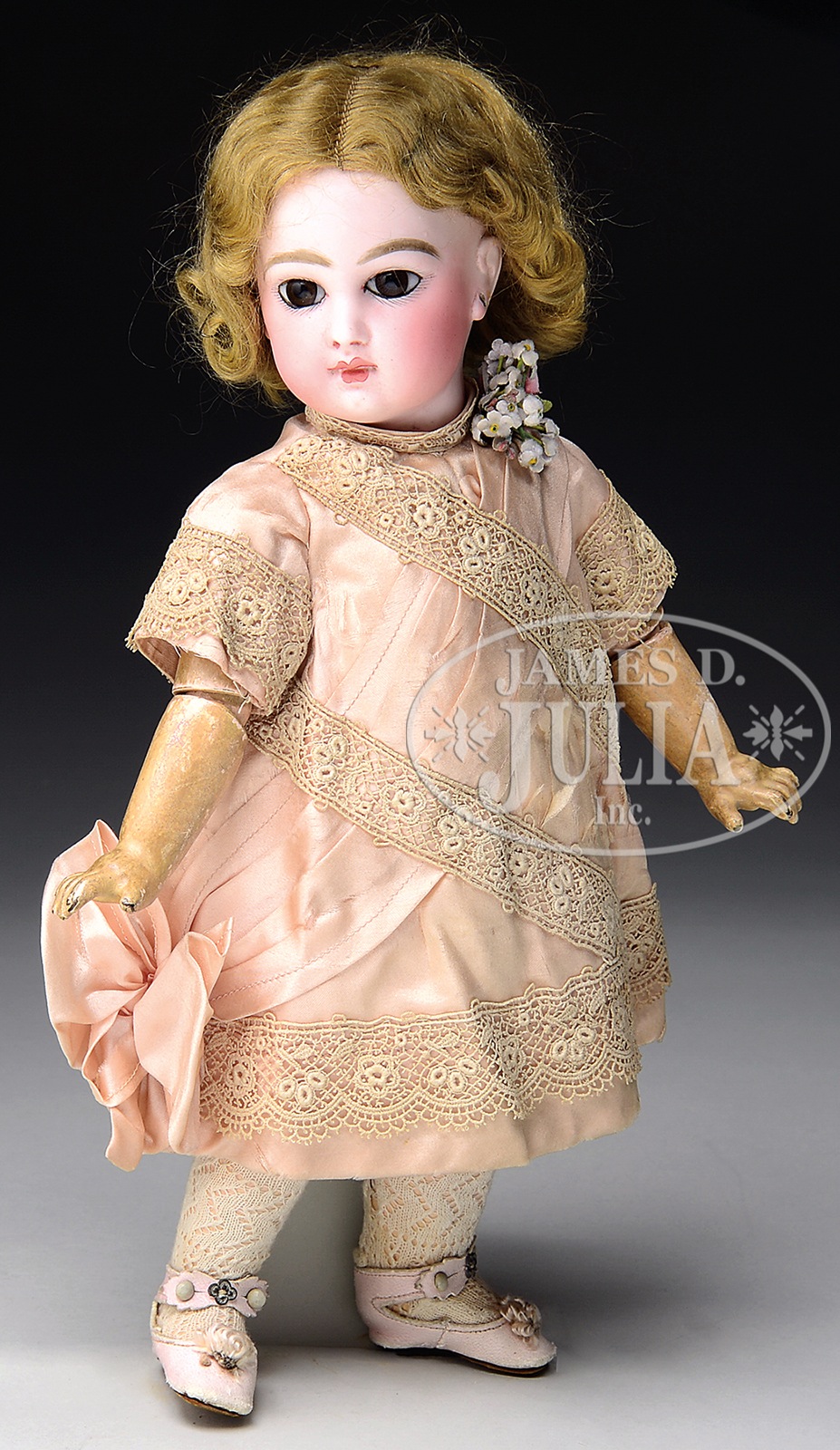 TRANSITIONAL JUMEAU BEBE.Pretty pressed bisque head incised “DEPOSE 5” having rich brown paperweight eyes, closed mouth with V-shaped upper lip and full bottom lip, well-painted eyebrows and eyelashes, pierced ears, on the original wood and composition body with straight wrists and eight separate balls joints. The torso is stamped in blue “JUMEAU MEDAILLE D’OR PARIS”. She is wearing an antique pink silk dress with ecru lace, antique pink leather keystone shoes, and a newer mohair wig over cork pate. SIZE: 13-1/2″ t (34cm). CONDITION: Overall very good, however arms have quite a bit of age wear and surface dirt. 1-14046 (3,500-5,500) – Lot 3164 Auction: Advertising, Toy & Doll - Spring 2014 Please Note: All prices include the hammer price plus the buyer’s premium, which is paid by the buyer as part of the purchase price. The prices noted here after the auction are considered unofficial and do not become official until after the 46th day. |