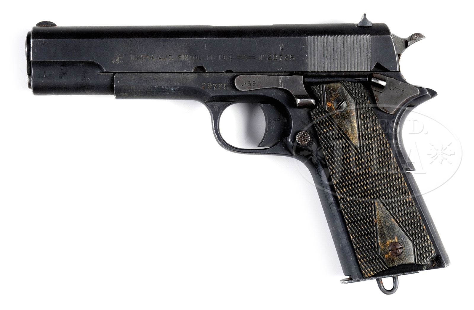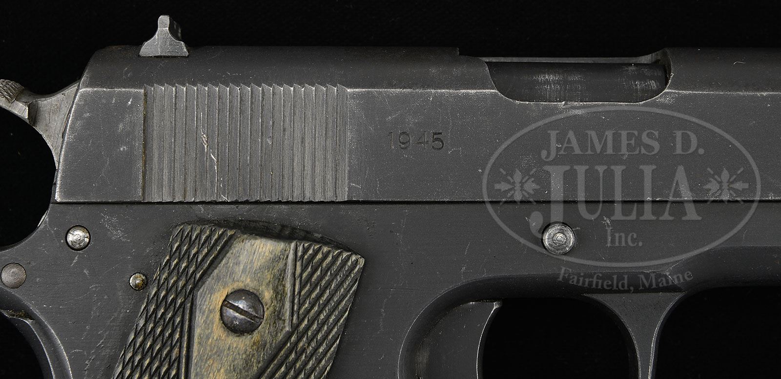 *◊ HIGH CONDITION NORWEGIAN MODEL 1914, RARE WAFFENAMPT MARKED NAZI PROCUREMENT, COLT PISTOL.SN 29735. Cal. 11.25 mm (45 ACP). Black phosphate finish with 5″ bbl and fixed sights. Left side of slide has usual markings with Waffenampt WaA8 cutting through the finish. Right side of slide is dated “1945”. Left forward side of frame has the SN with last 3 digits of matching SN on various parts, including trigger, thumb safety, grip safety, spring housing, slide lock and bbl. No further disassembly was effected to check for additional matching parts. Mounted with light colored wood (probably birch) diamond checkered grips. Accompanied by one orig Lanyard loop magazine. These pistols are rarely encountered with the WaA mark and completely matching. PROVENANCE: Collection of Dr. Geoffrey Sturgess. CONDITION: Fine, overall retains at least 95% black phosphate finish. Grips are sound, showing light to moderate diamond point wear. Magazine is fine. Bright shiny bore with frosting. Mechanics are crisp. Very difficult to find an all original Nazi WaA marked contract Norwegian M1914. 4-52375 JR206 (4,000-6,500) – Lot 3164